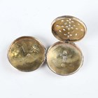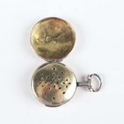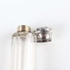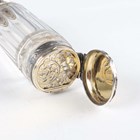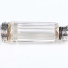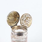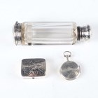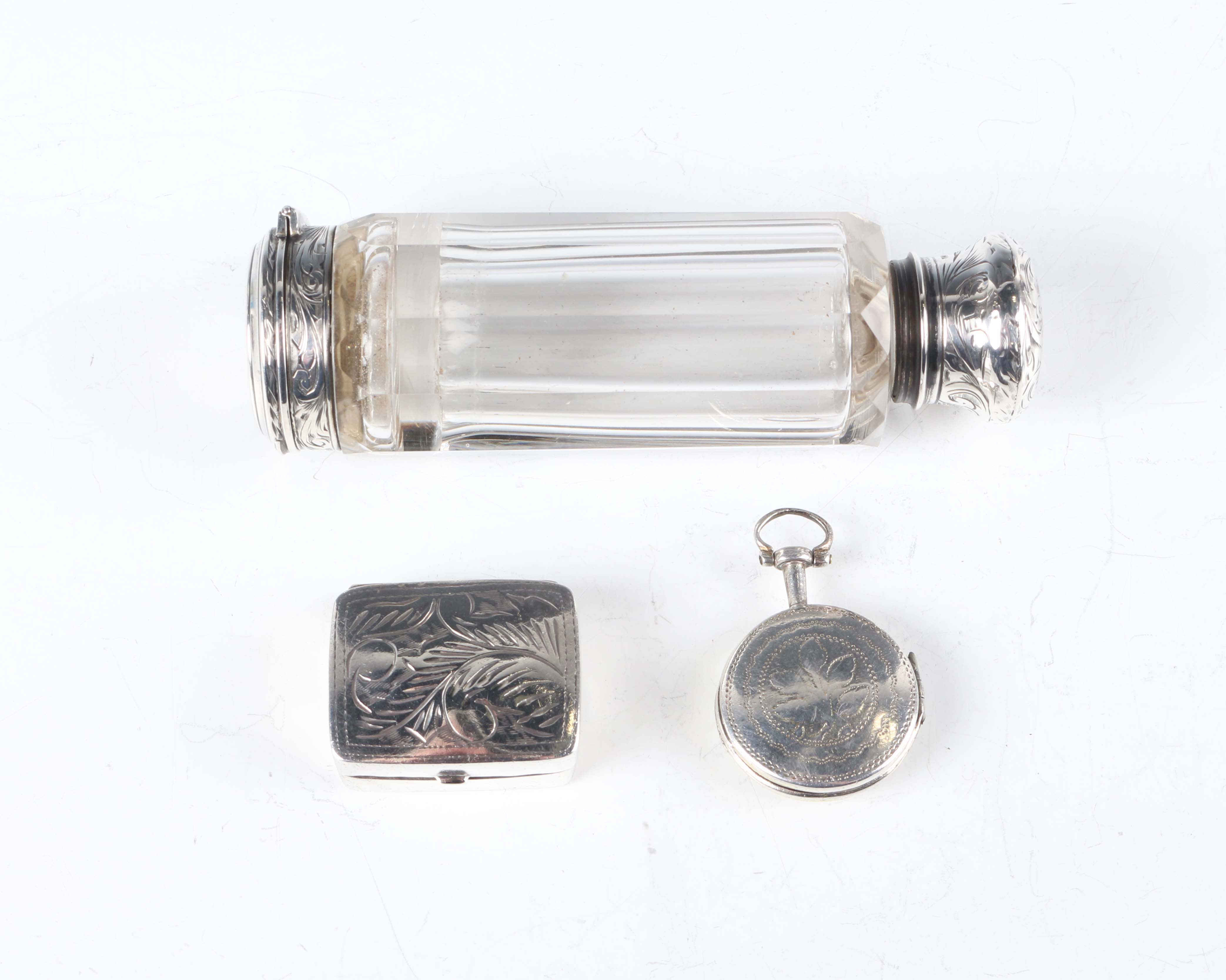 A George III silver circular pendant vinaigrette with engraved decoration, the hinged lid revealing a gilt interior with a pierced hinged grille, Birmingham 1813 by William Lea & Co, length 3.5cm, and a .925 silver pillbox, total weight 18.8g, together with a silver mounted faceted cut glass scent and vinaigrette bottle, one end with hinged lid revealing a pierced and engraved hinged grille, the other end with screw cover, unmarked, length 9.8cm.
