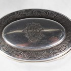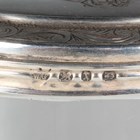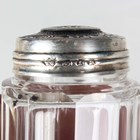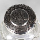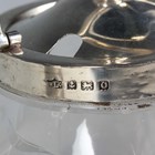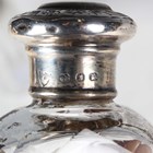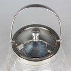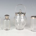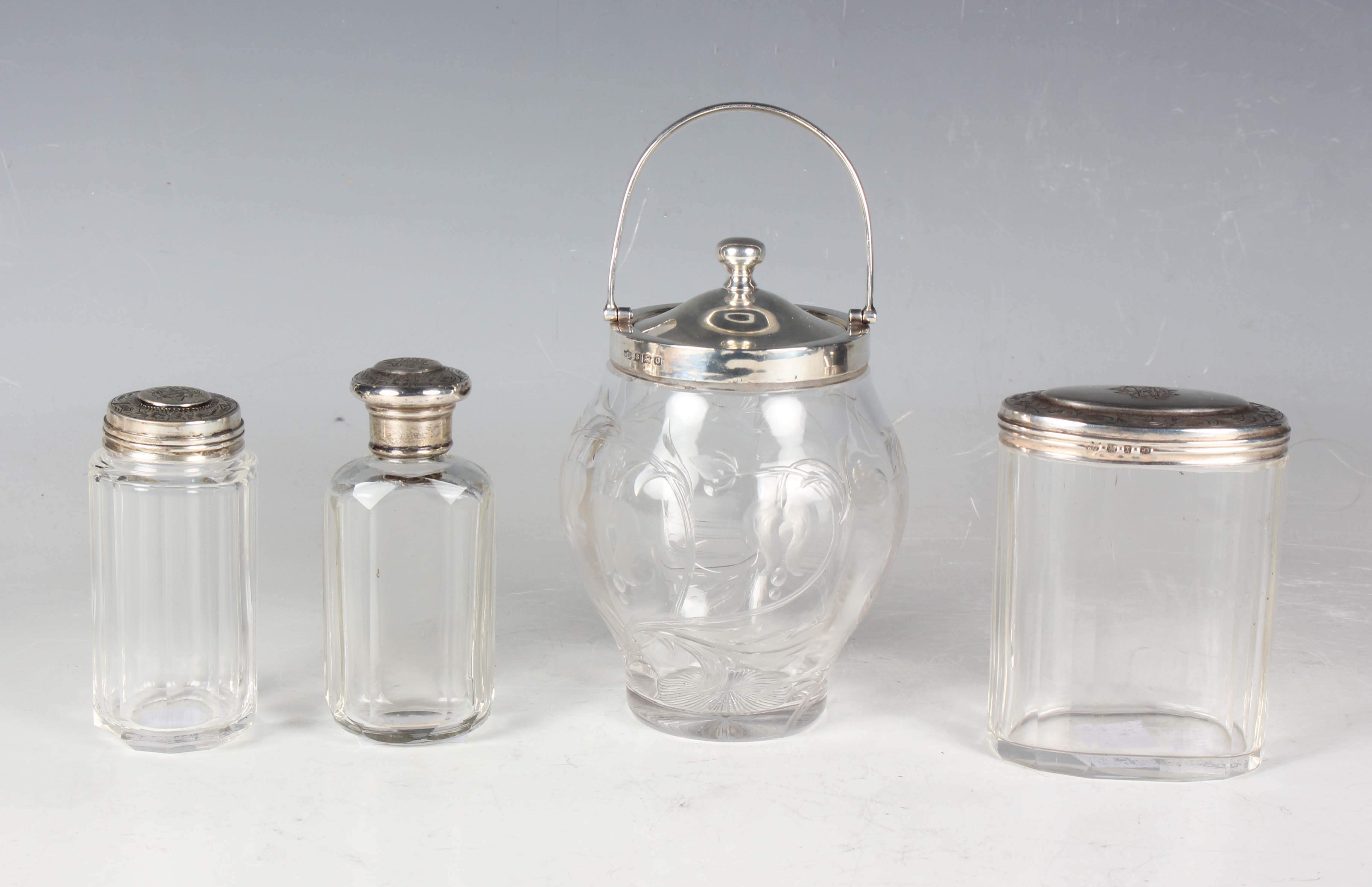 A George V silver mounted clear glass preserve jar and cover with swing handle, the body intaglio cut with stylized flowers and leaves, Birmingham 1913 by W. Coulthard Ltd, total height 16cm, and a set of three silver lidded faceted cut glass dressing table bottles, each silver lid monogram and scroll engraved, weight of three lids 36.8g.