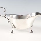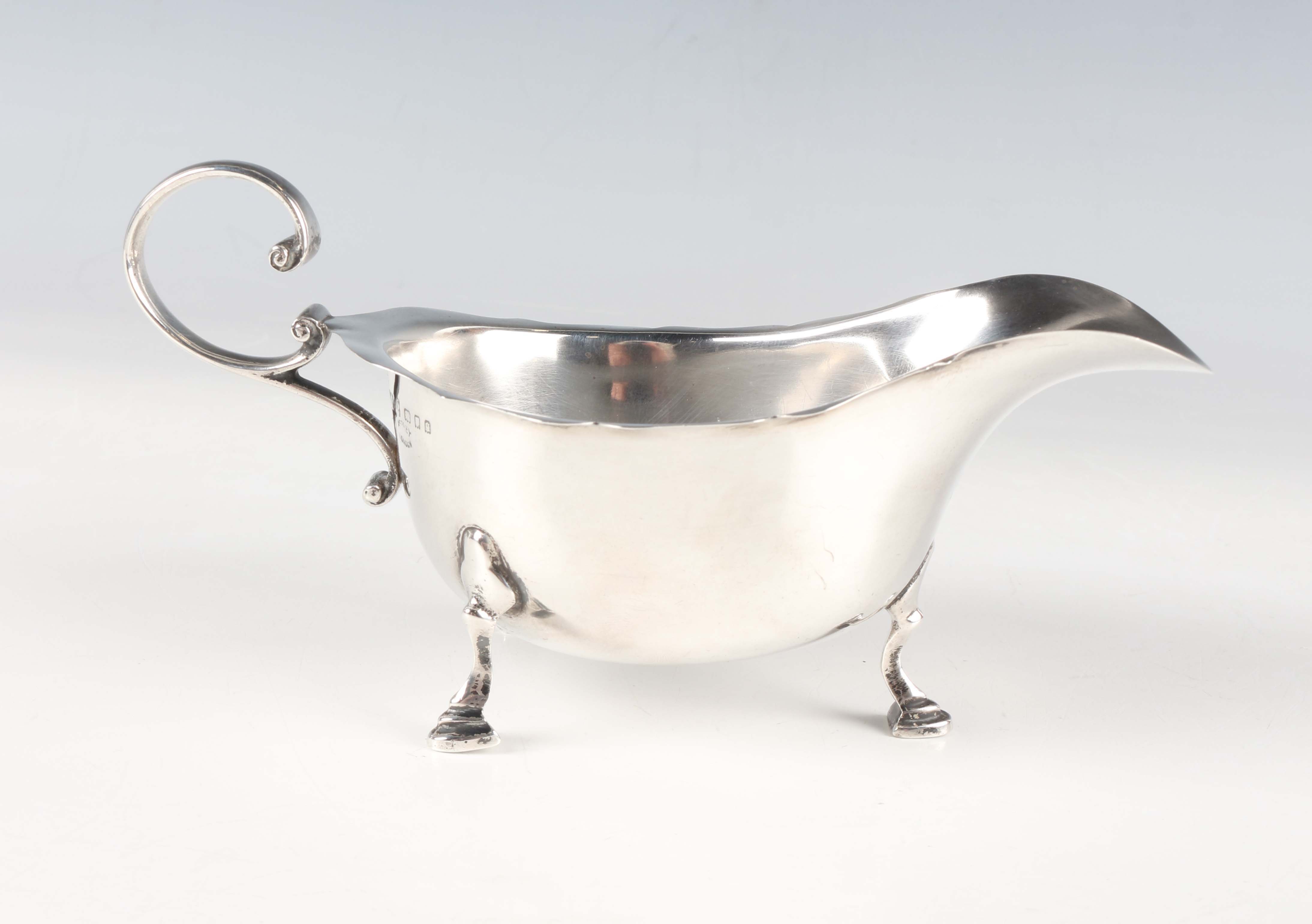 A George V silver sauceboat with scroll handle, London 1931 by Asprey & Co Ltd, weight 91.5g, length 16.2cm.