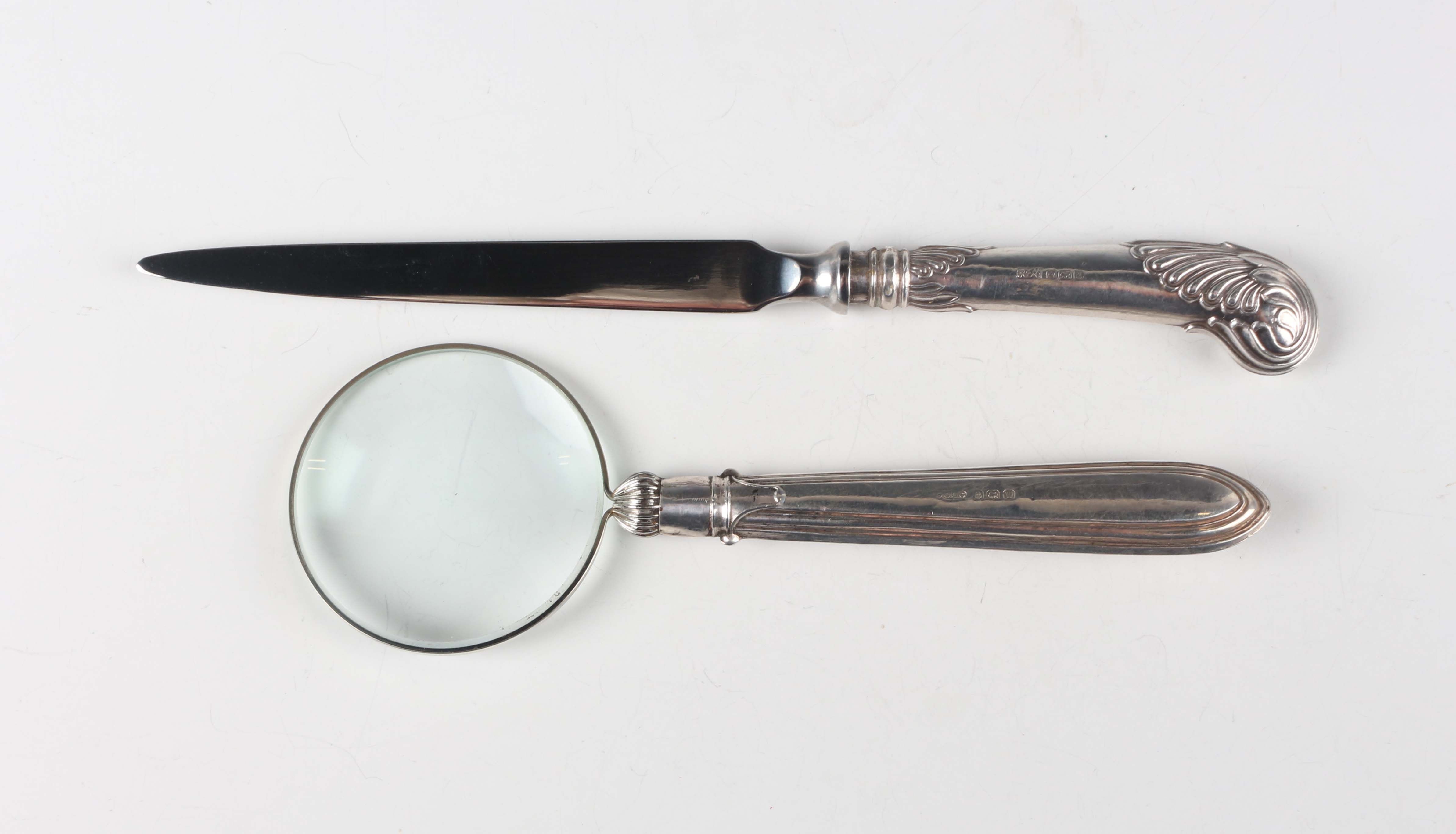 A silver handled magnifying glass, Birmingham 1921, length 15.5cm, and a silver pistol handled letter opener, length 19.4cm.