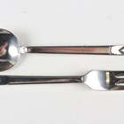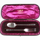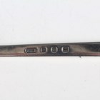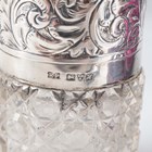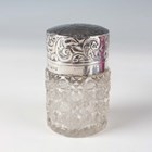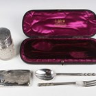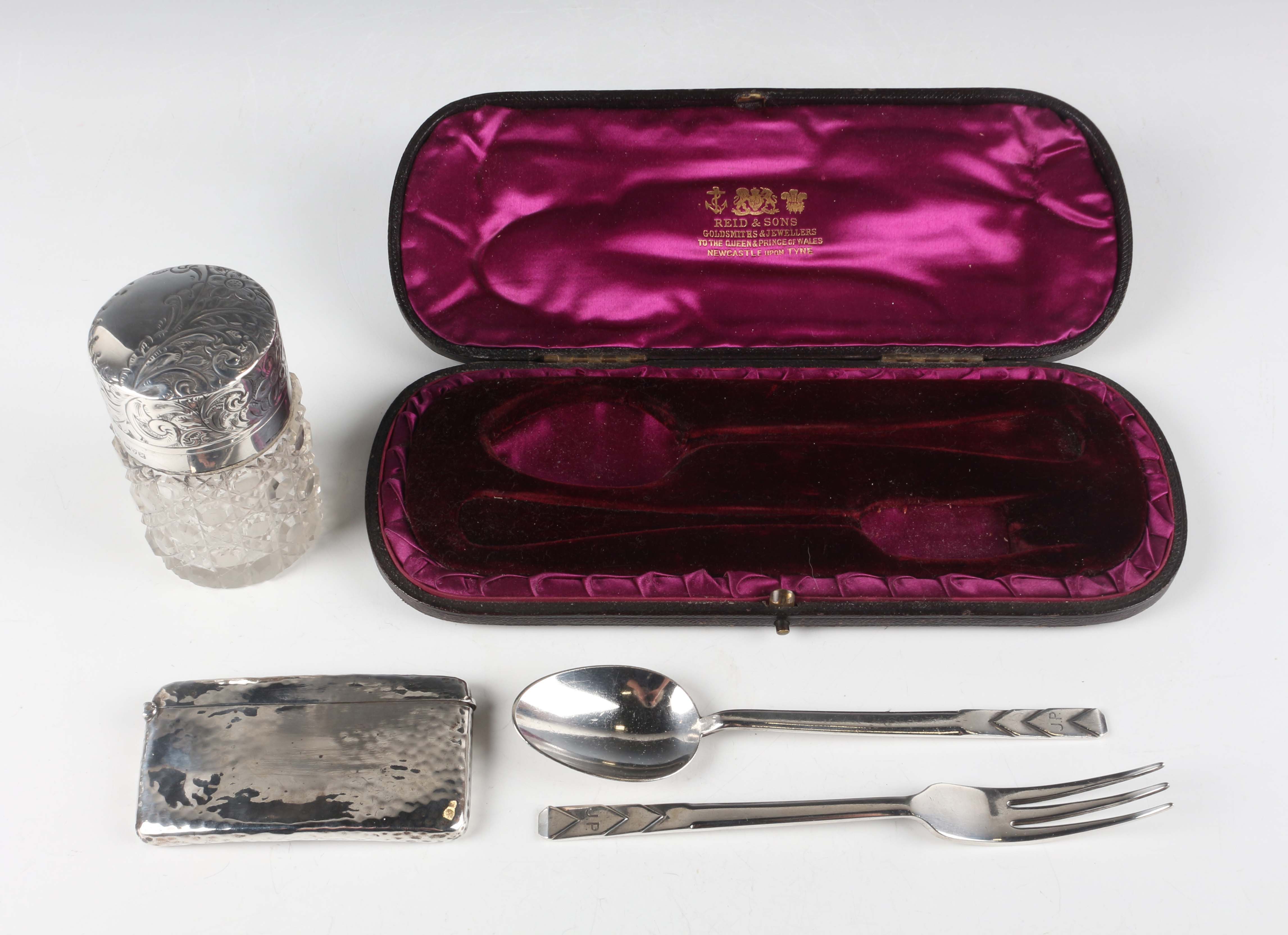 An Edwardian silver and cut glass salts jar with hinged lid, Chester 1908 by Robert Pringle & Sons, height 8cm, an Art Deco silver christening fork and spoon, London 1937 by Robert Edgar Stone, weight 62.8g, in an earlier matched box, and a silver card case with hammered decoration, Chester 1915, weight 46.8g, length 8.3cm.