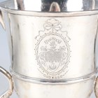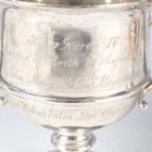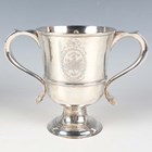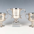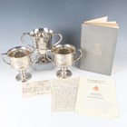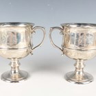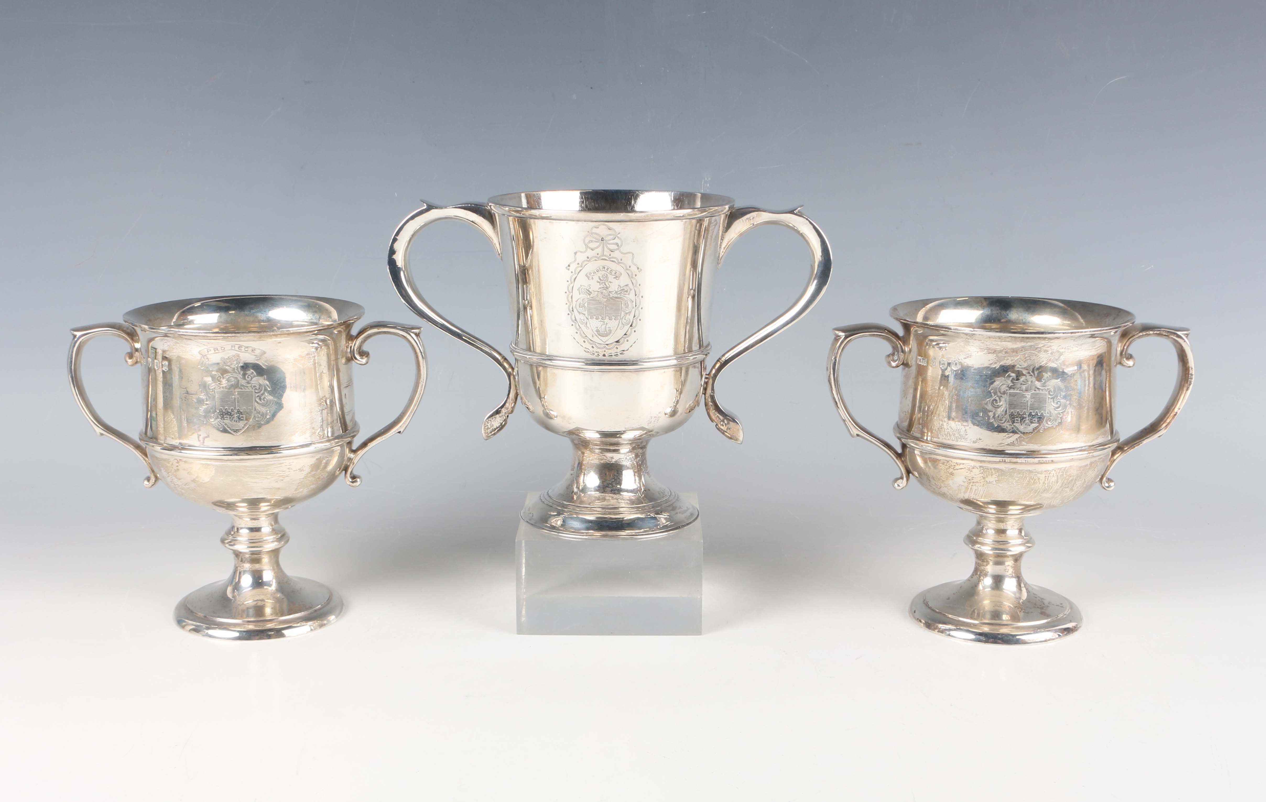 A pair of George V silver two-handled cups, commemorating King George IV's historic royal visit to Scotland in 1822, each with girdled body and scroll handles, on a circular foot, one side engraved with the crest of Macfie, the other side with inscription 'King George IV landed at Leith 15 August 1822' above 'John Macfie Chief Magistrate...', Edinburgh 1921 by Mackay & Chisholm, total weight 930.4g, height 12.7cm, together with another Scottish silver two-handled cup, engraved with the crest of Macfie, Edinburgh 1893 by Mackay & Chisholm, weight 363.8g, height 13.2cm, a 'John Macfie of Edinburgh & His Family' book, circa 1938, and other related paperwork.