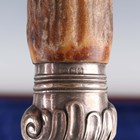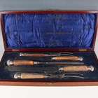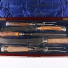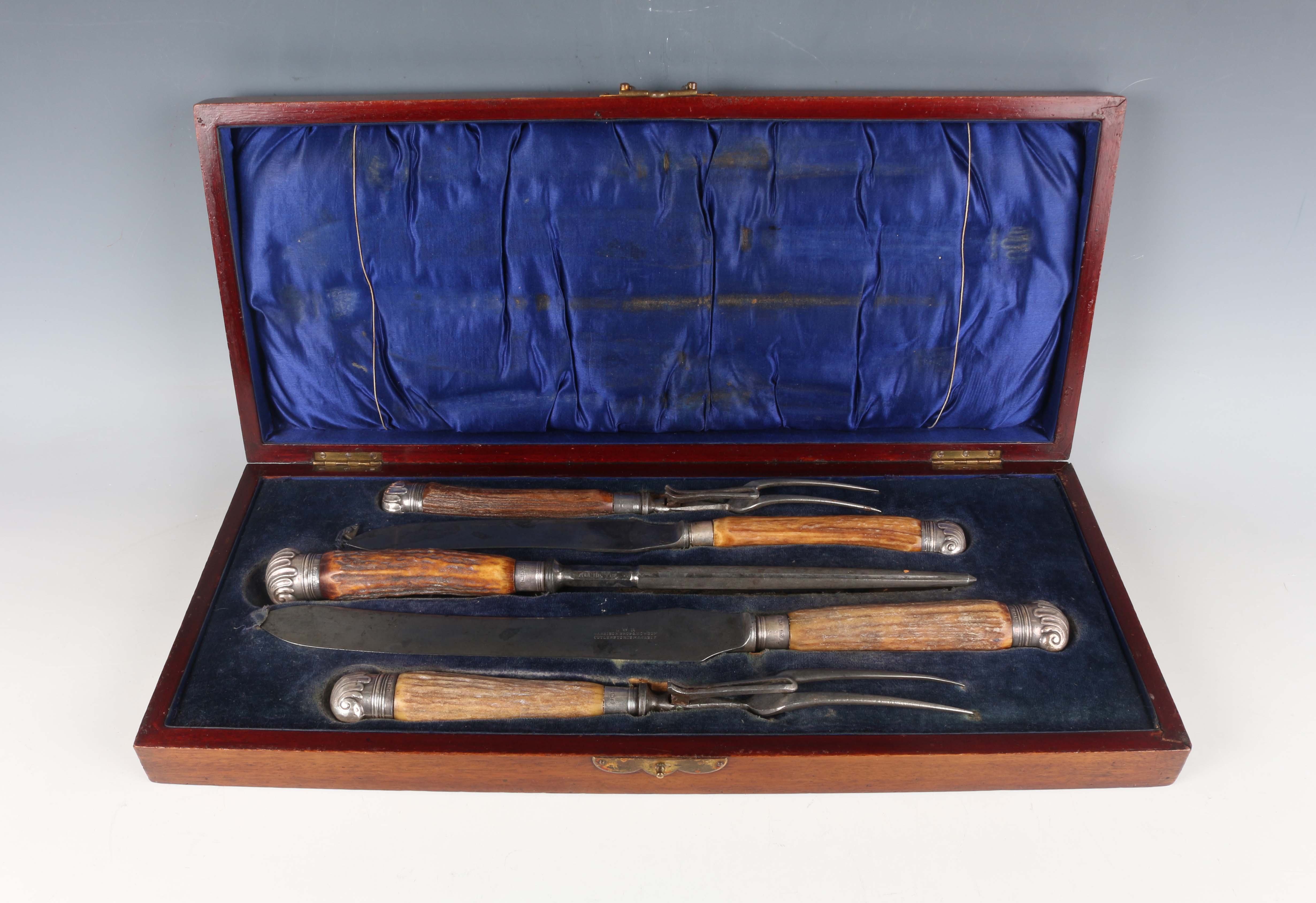 A George V silver mounted antler handled and steel five-piece carving set, comprising two knives, two forks and a steel, Sheffield 1911-1917, within a fitted mahogany case.
