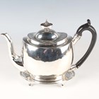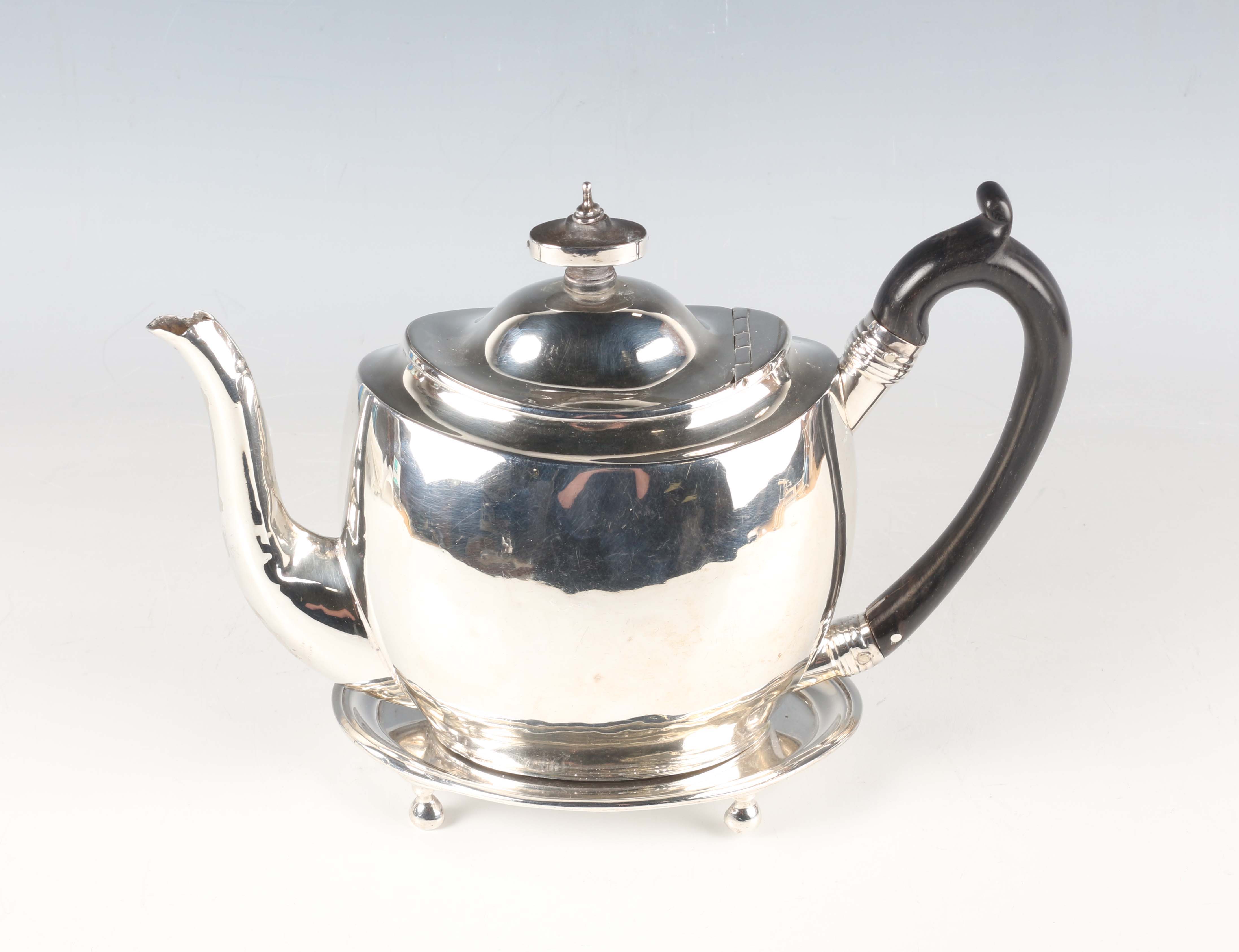A George III silver oval teapot and stand, on ball feet, London 1805, indistinct maker's mark, total weight 527.8g, height of teapot 16cm, length of stand 15cm.