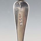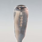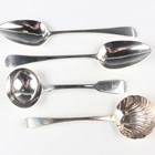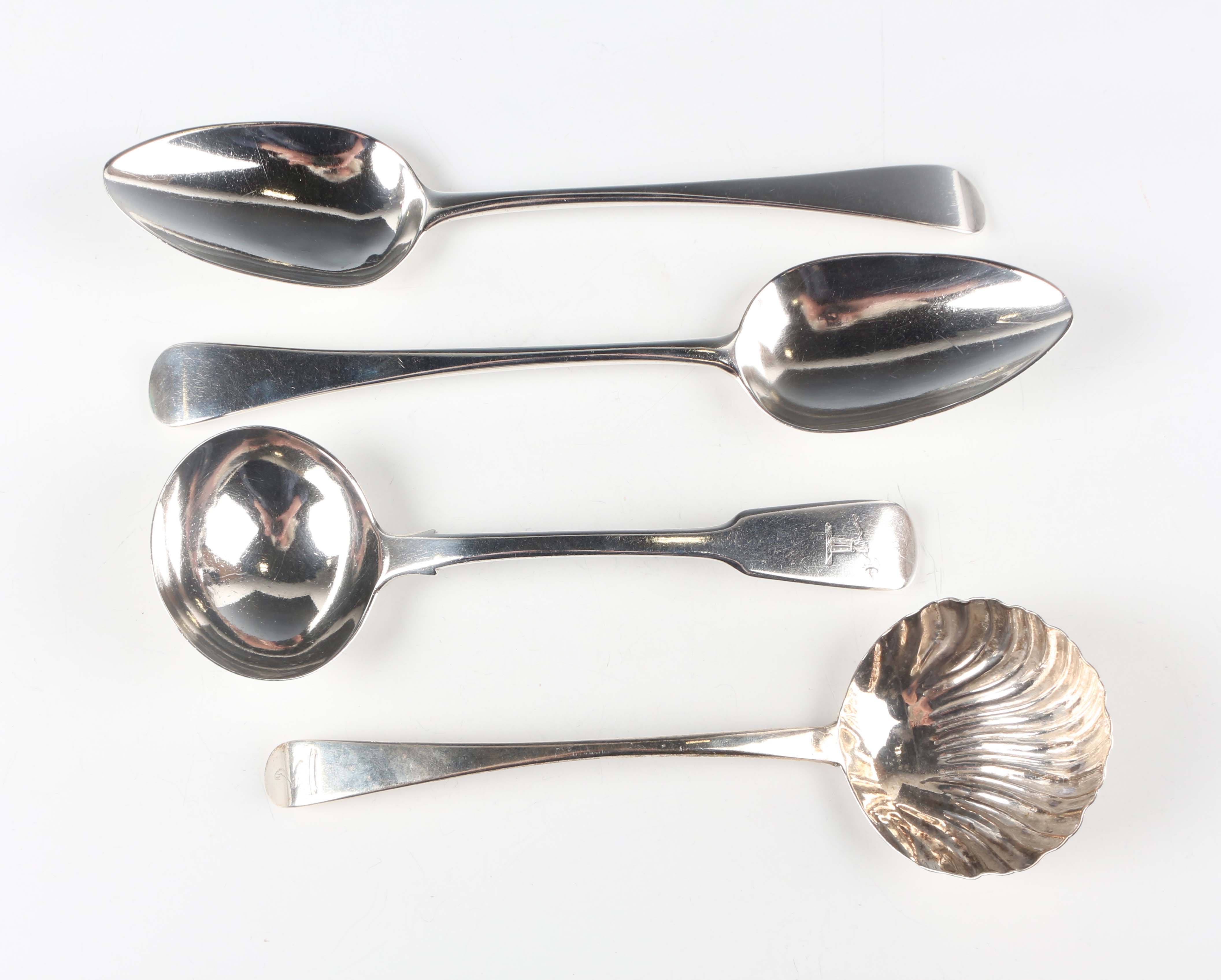 A George III silver Old English pattern sauce ladle with scallop shell bowl, London 1766 by George Baskerville, length 18.5cm, a pair of silver Old English pattern tablespoons, London 1814 by Peter & William Bateman, length 22.3cm, and a silver Fiddle pattern sauce ladle, London 1833 by John Henry & Charles Lias, length 17.5cm, total weight 241g.