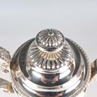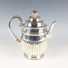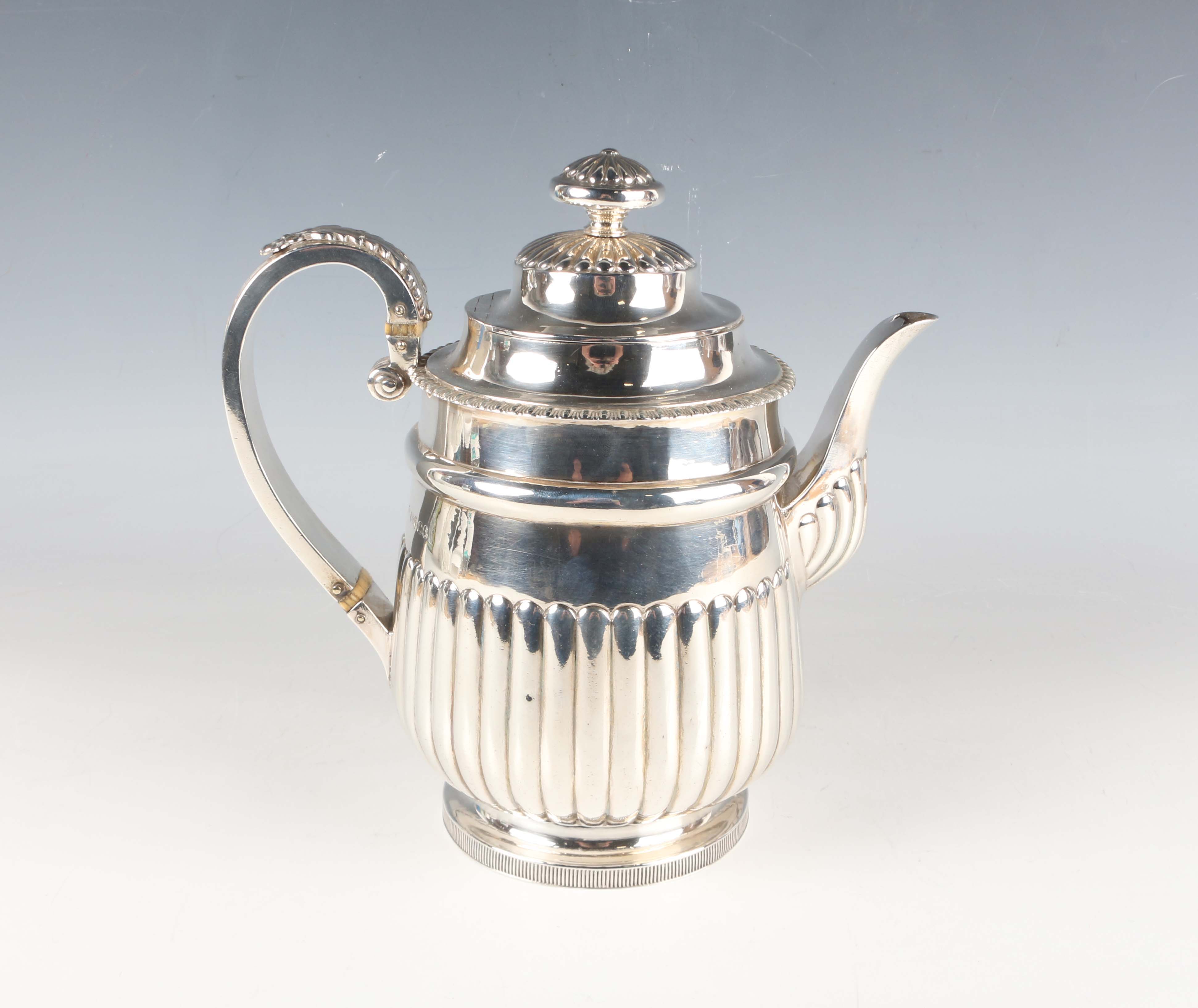 A George III silver hot water pot with domed cover and daisy finial above a gadrooned rim and half-reeded tapering cylindrical body, flanked by a foliate and flowerhead scroll handle, on a circular foot, London 1818 by Michael Starkey, weight 704.8g, height 22cm. Note: a non-transferrable ivory exemption certificate has been granted for the sale of this item.