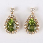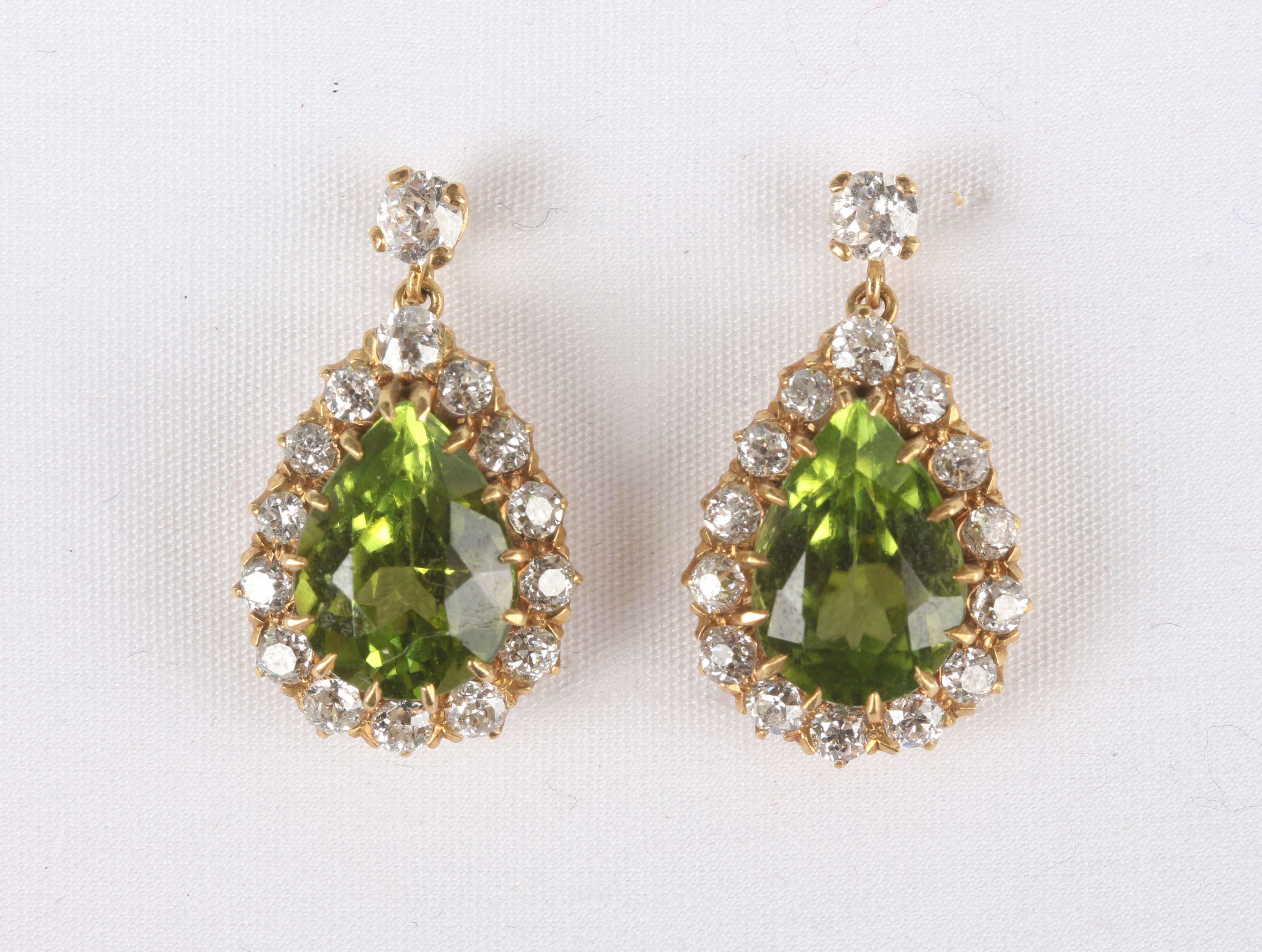 A pair of gold, peridot and diamond pendant cluster earrings, each claw set with a pear shaped peridot within a surround of cushion shaped diamonds, with a diamond single stone surmount, with post and butterfly fittings, unmarked, total weight 8.6g, length 2.5cm.