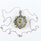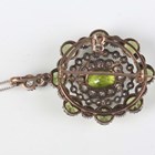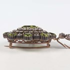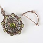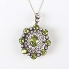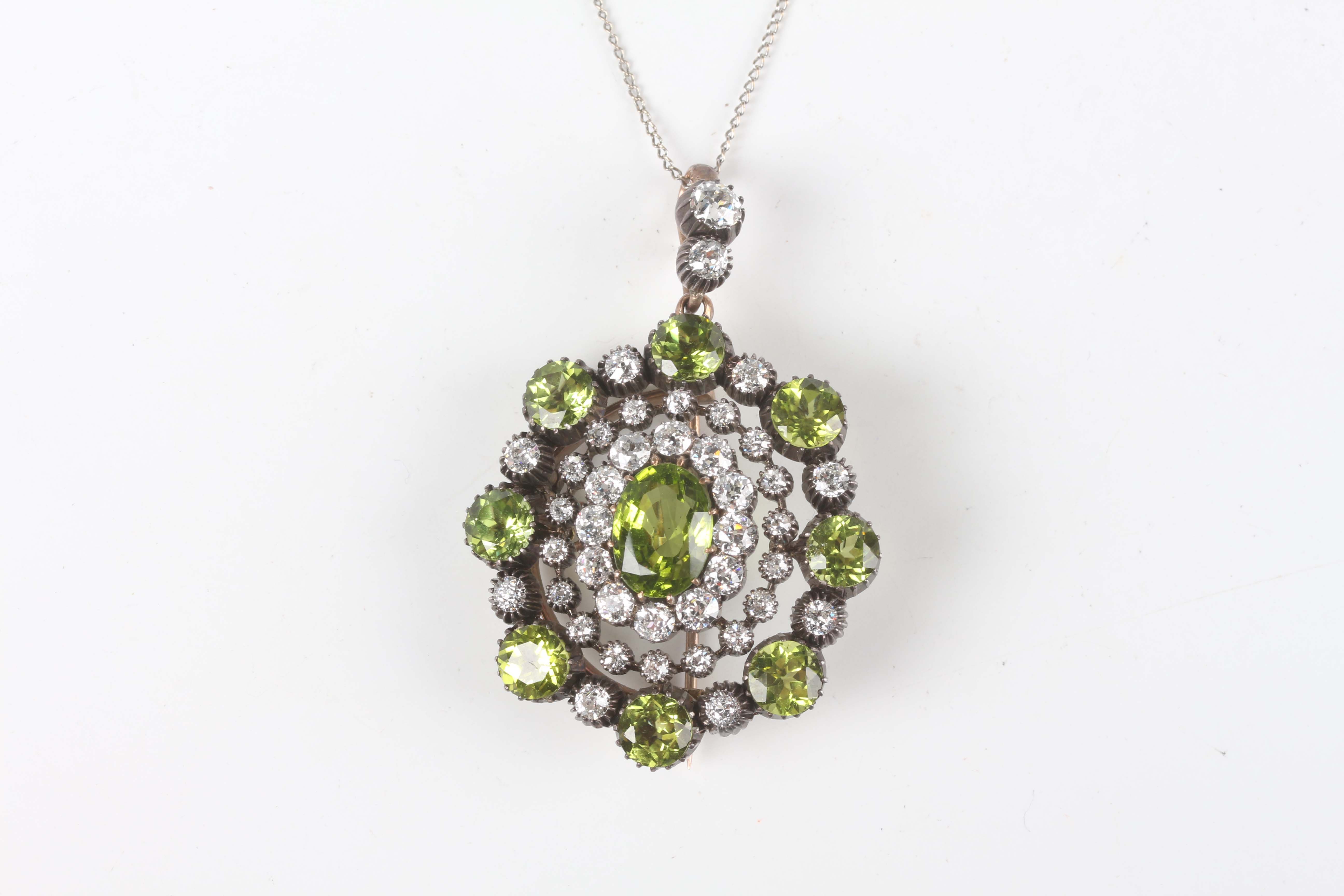 A gold backed and silver set peridot and diamond oval pendant with detachable brooch fitting, claw set with the principal oval cut peridot within a two row surround of cushion shaped diamonds, the outer border mounted with eight circular cut peridots alternating with eight smaller cushion shaped diamonds, with a diamond two stone suspension, unmarked, weight 17.3g, length 5.3cm, width 3.5cm, with a 9ct white gold neckchain, detailed '375', weight 1.7g, length 55cm.