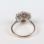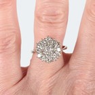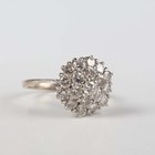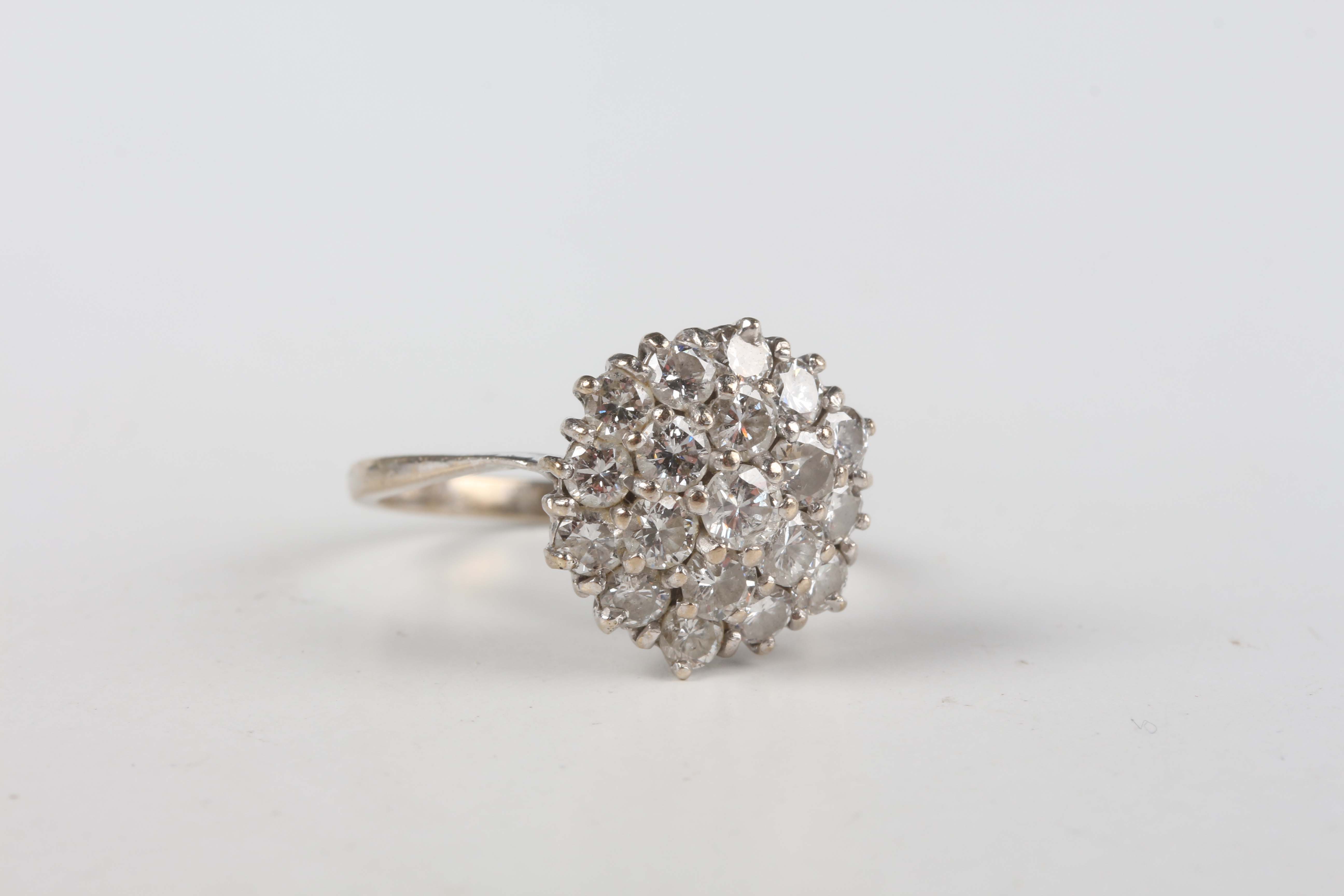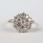 A white gold and diamond hexagonal cluster ring, claw set with round brilliant cut diamonds in a three tier design, detailed ‘18ct’, weight 4.4g, ring size approx O.