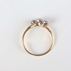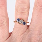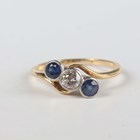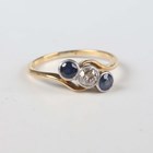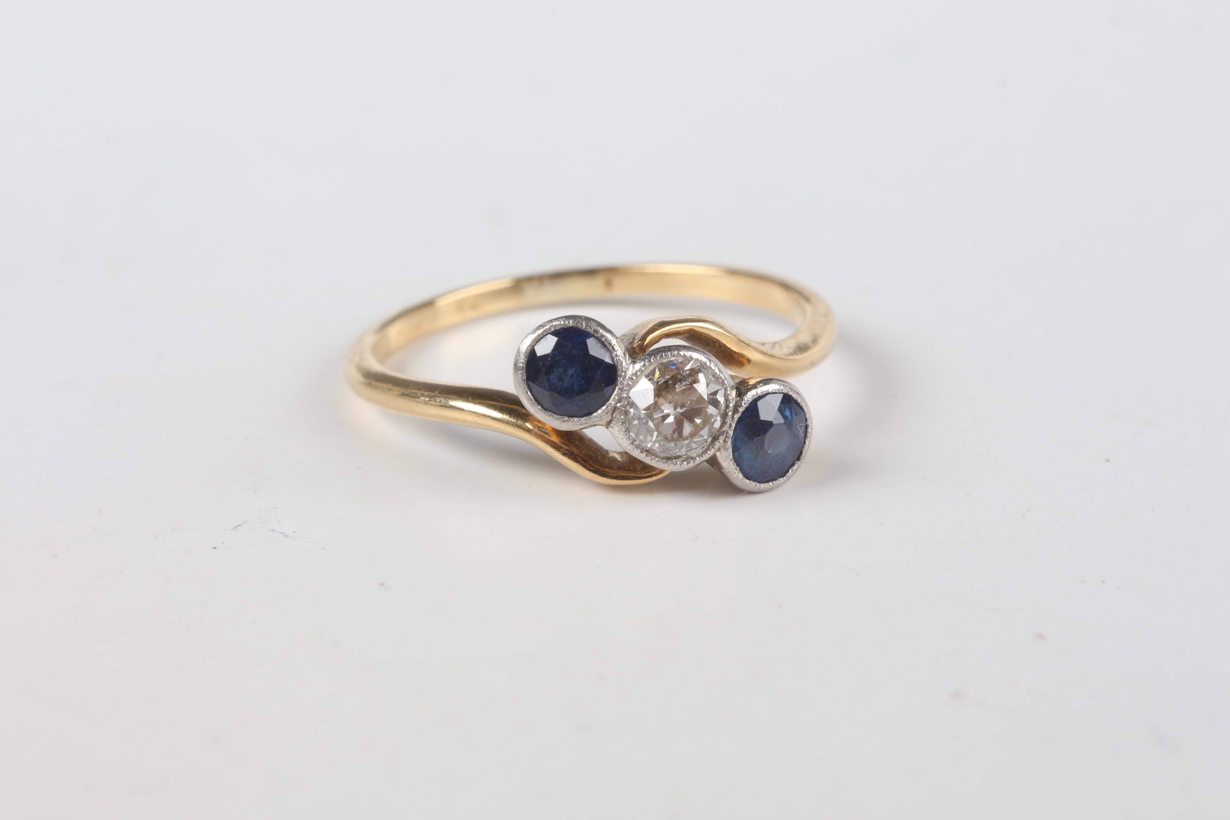 A gold, diamond and sapphire three stone ring, collet set with a cushion shaped diamond between two collet set cushion shaped sapphires, detailed ‘18’, weight 2.3g, ring size approx N1/2.