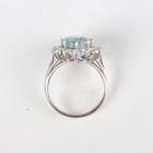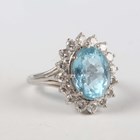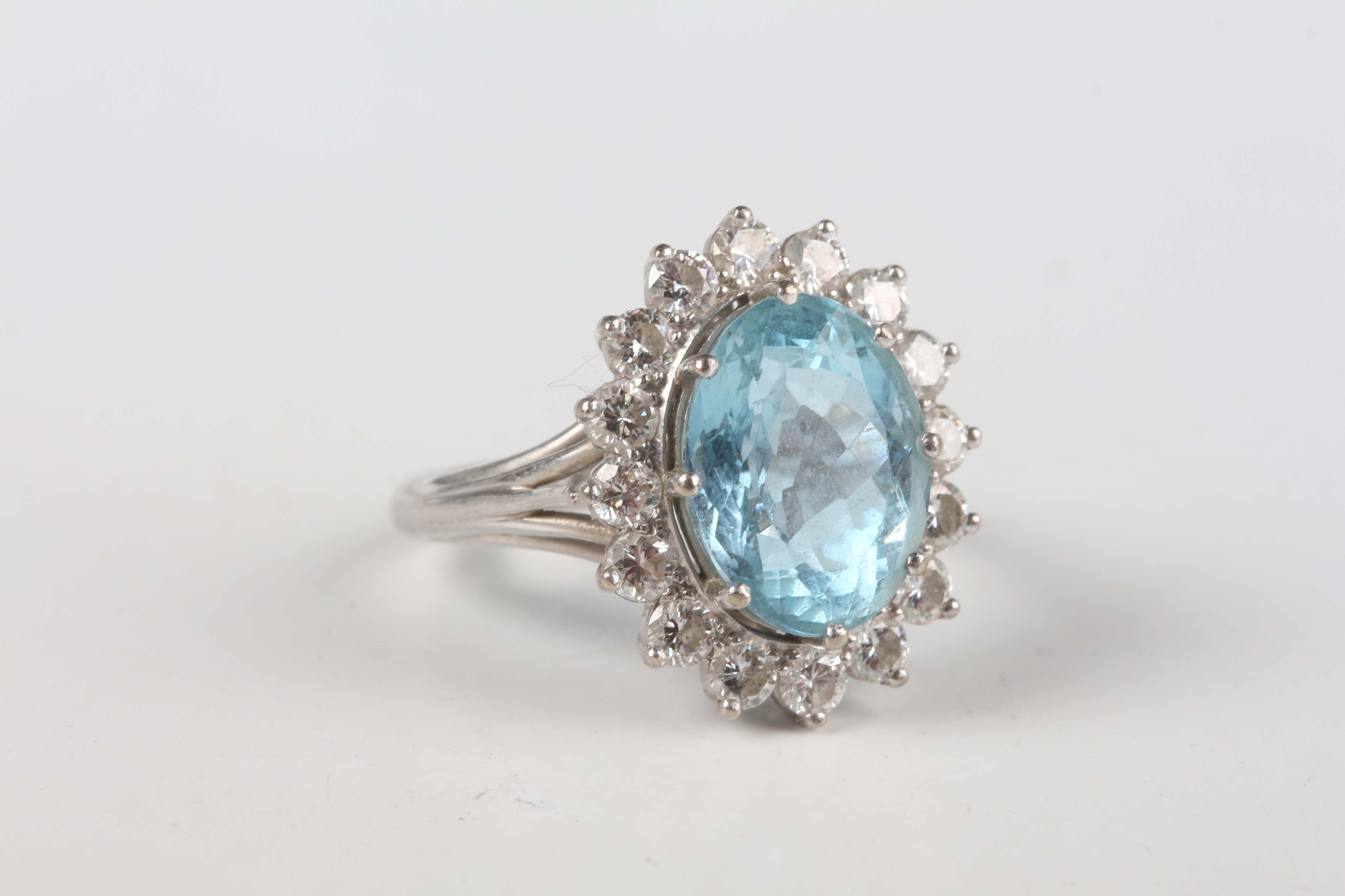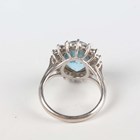 An 18ct white gold, aquamarine and diamond oval cluster ring, claw set with the oval cut aquamarine within a surround of circular cut diamonds, weight 6.9g, ring size approx O.