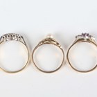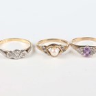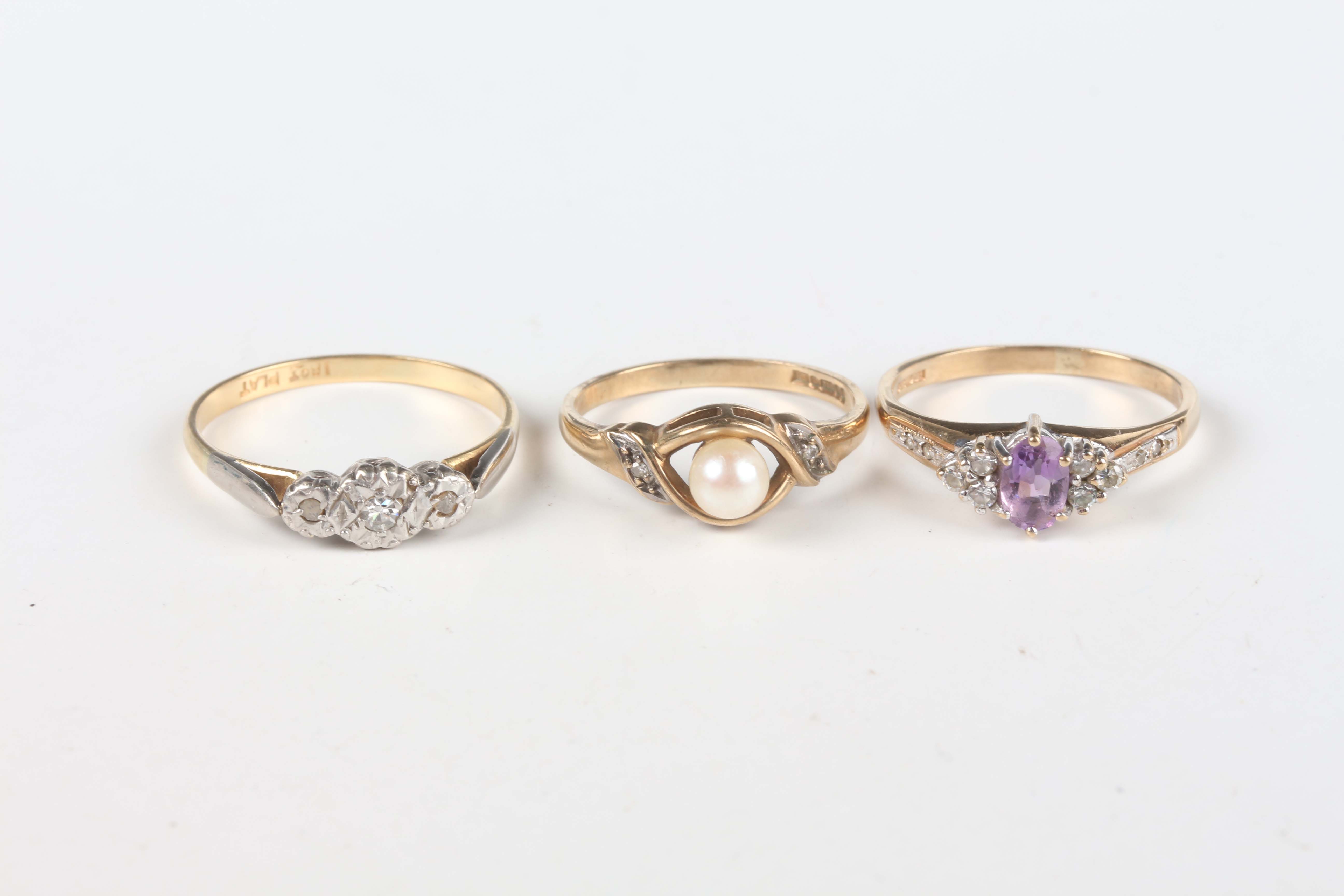 An 18ct gold, platinum and diamond three stone ring, detailed '18ct Plat', weight 2.5g, ring size Q1/2, a 9ct gold, amethyst and colourless gem set ring, ring size approx N1/2, and a 9ct gold, cultured pearl and diamond ring, ring size approx L1/2, total weight 3.8g.