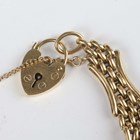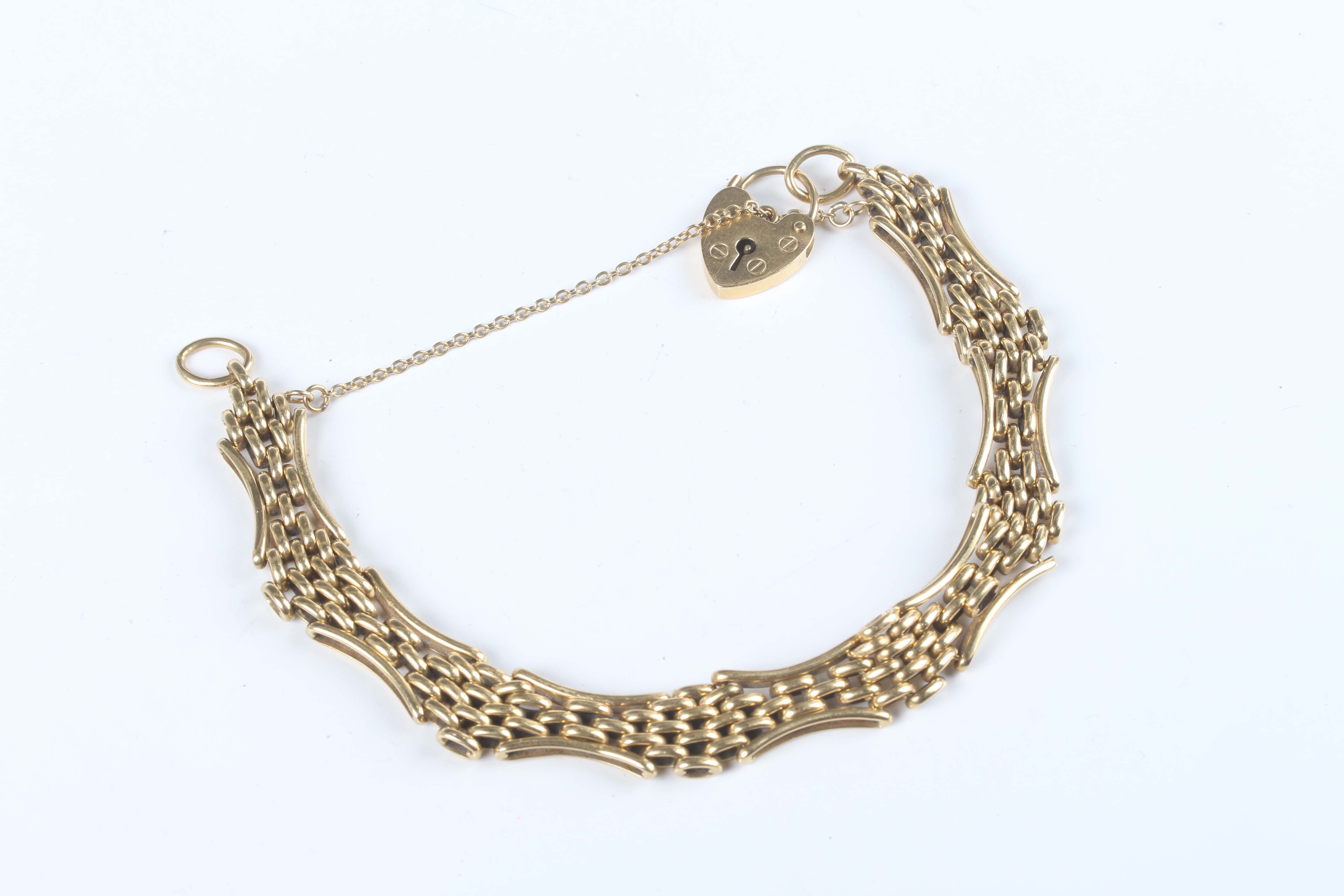 An 18ct gold oval and curved bar gatelink bracelet on an 18ct gold heart shaped padlock clasp, weight 30.7g, length 19cm, with a case.