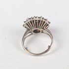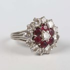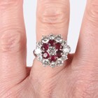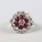 A ruby and diamond cluster ring, claw set with the principal circular cut diamond within a surround of six circular cut rubies and an outer border of twelve alternating larger and smaller circular cut diamonds, unmarked, weight 7.3g, ring size approx J1/2 (note sizing beads).