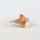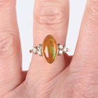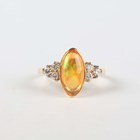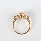 An 18ct gold ring, collet set with an oval fire opal between circular cut diamond three stone shoulders, weight 4.5g, ring size approx N1/2, with a case.