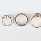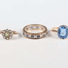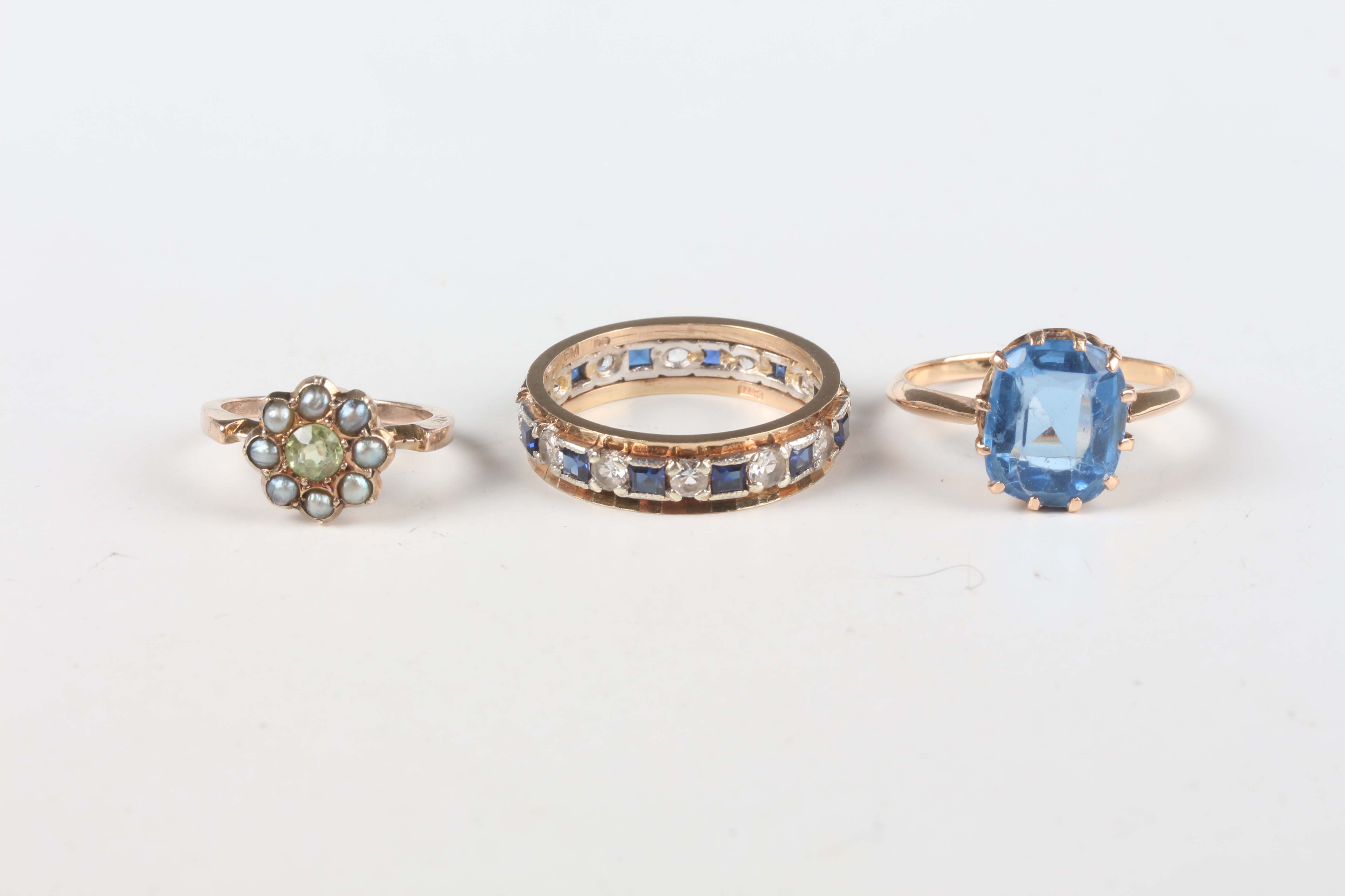 A 9ct gold, blue and colourless gem set eternity ring, ring size approx O1/2, a gold ring, claw set with a cushion shaped pale blue gem, unmarked, ring size approx M1/2, and a gold, peridot and seed pearl cluster ring, detailed ‘9ct’, ring size approx D1/2, total weight 8.2g.