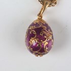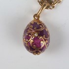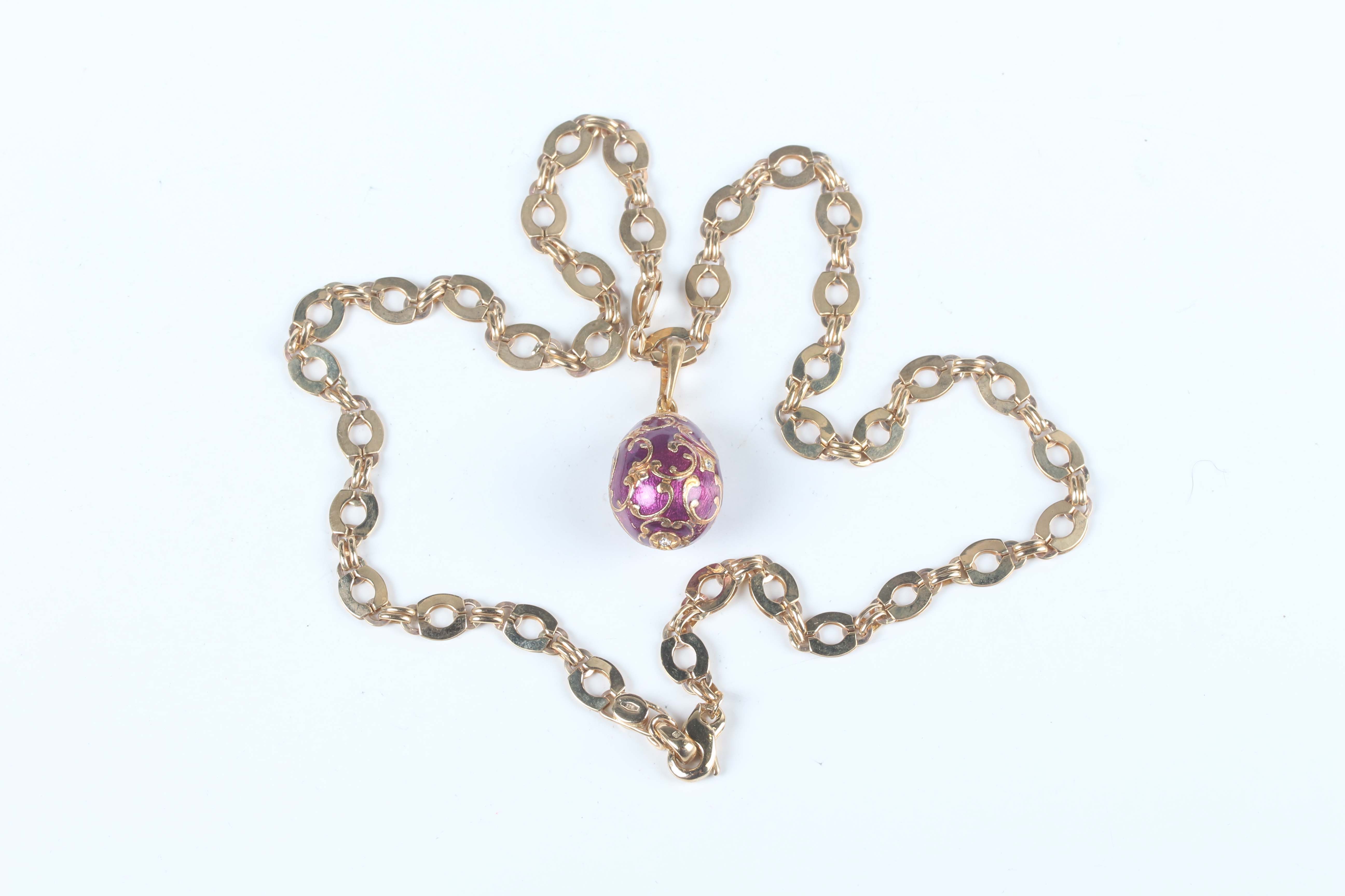 An Italian 9ct gold neckchain in an oval flatlink design, weight 10.4g, length 45cm, with a silver gilt and purple enamelled egg shaped pendant, detailed 'VLS', length 3cm, with a case.