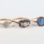 A 9ct gold and diamond cluster ring, ring size approx K, a 9ct gold, sapphire and diamond ring, mounted with three small diamonds within a surround of sapphires, ring size approx M1/2, and a gold and silver set, blue and colourless gem set ring, detailed ‘9ct’, ring size approx P, total weight 5.8g.