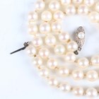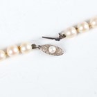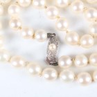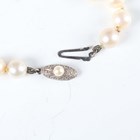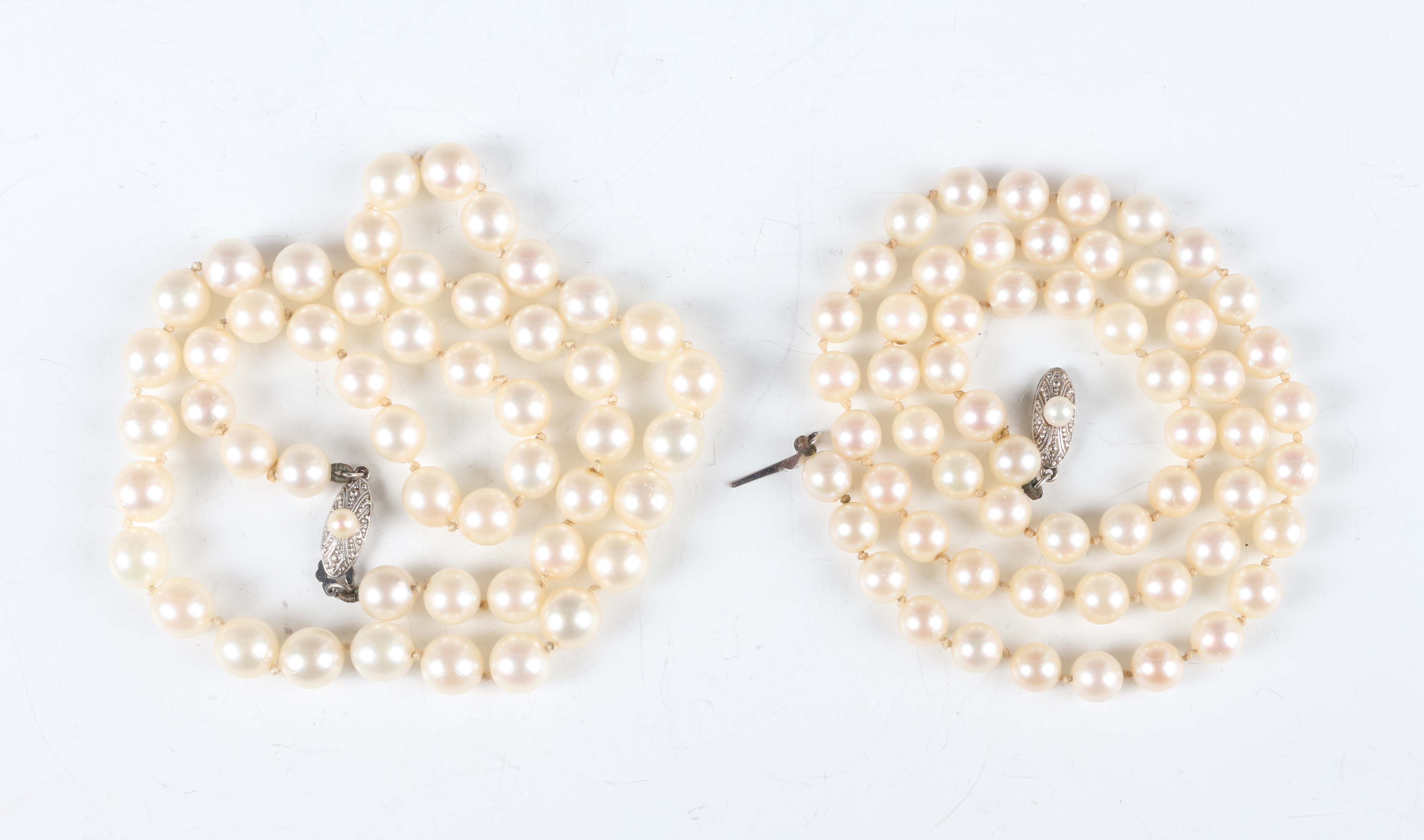 A Mikimoto single row necklace of cultured pearls on a white gold and cultured pearl clasp, detailed ‘K10’, length 43cm, and another Mikimoto single row necklace of cultured pearls on a white gold and cultured pearl clasp, detailed ‘K10’, length 44cm (clasp broken), with a Mikimoto case.