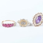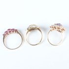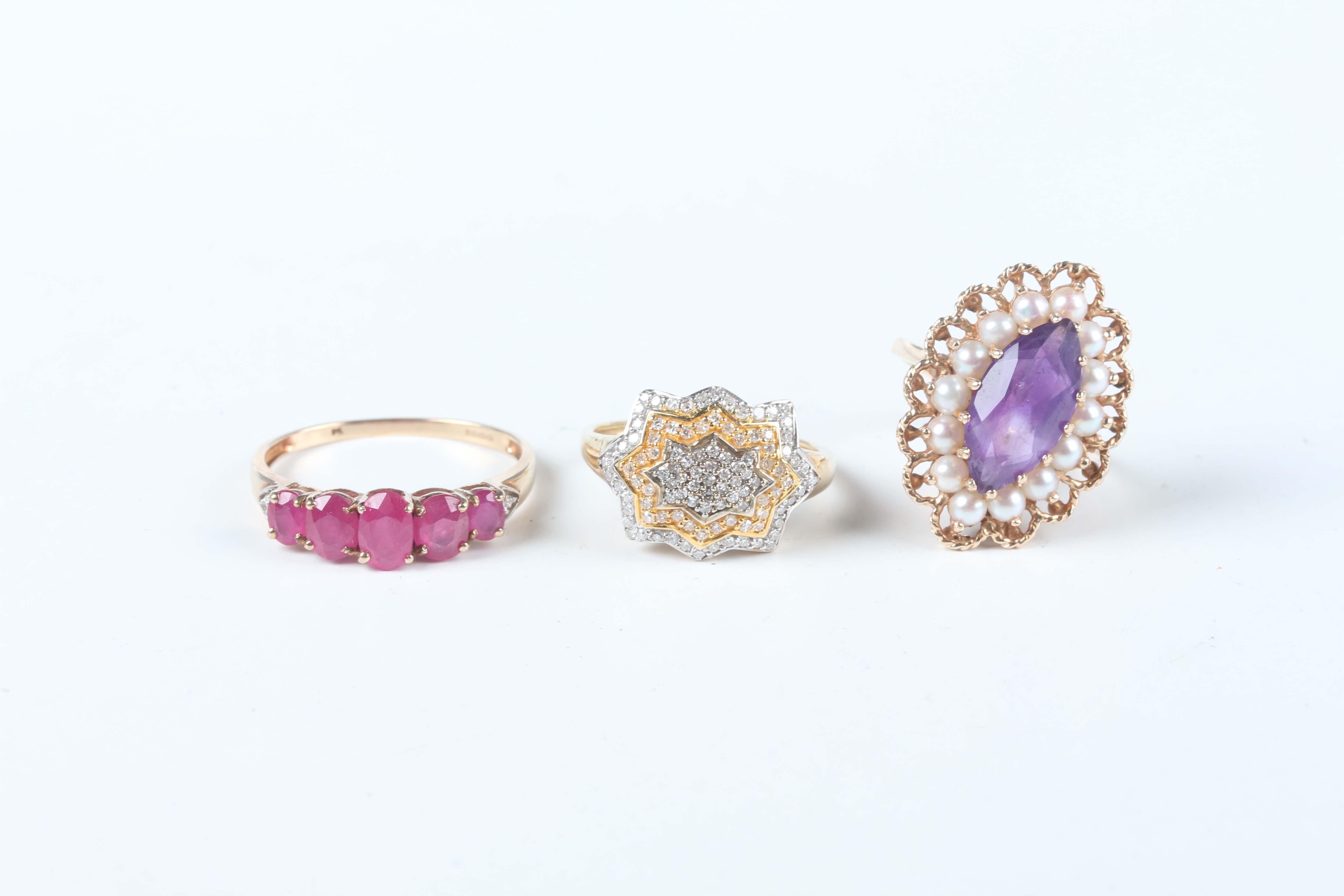 A 9ct gold, amethyst and half-pearl set oval cluster ring, decorated with a wirework border, London 1971, ring size approx I1/2, a 9ct two colour gold and diamond ring in a panel shaped cluster design, ring size approx M1/2, and a 9ct gold and ruby five stone ring, claw set with a row of graduated oval cut rubies, ring size approx S, total weight 10.4g.