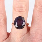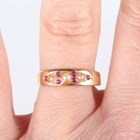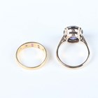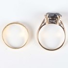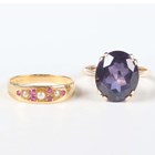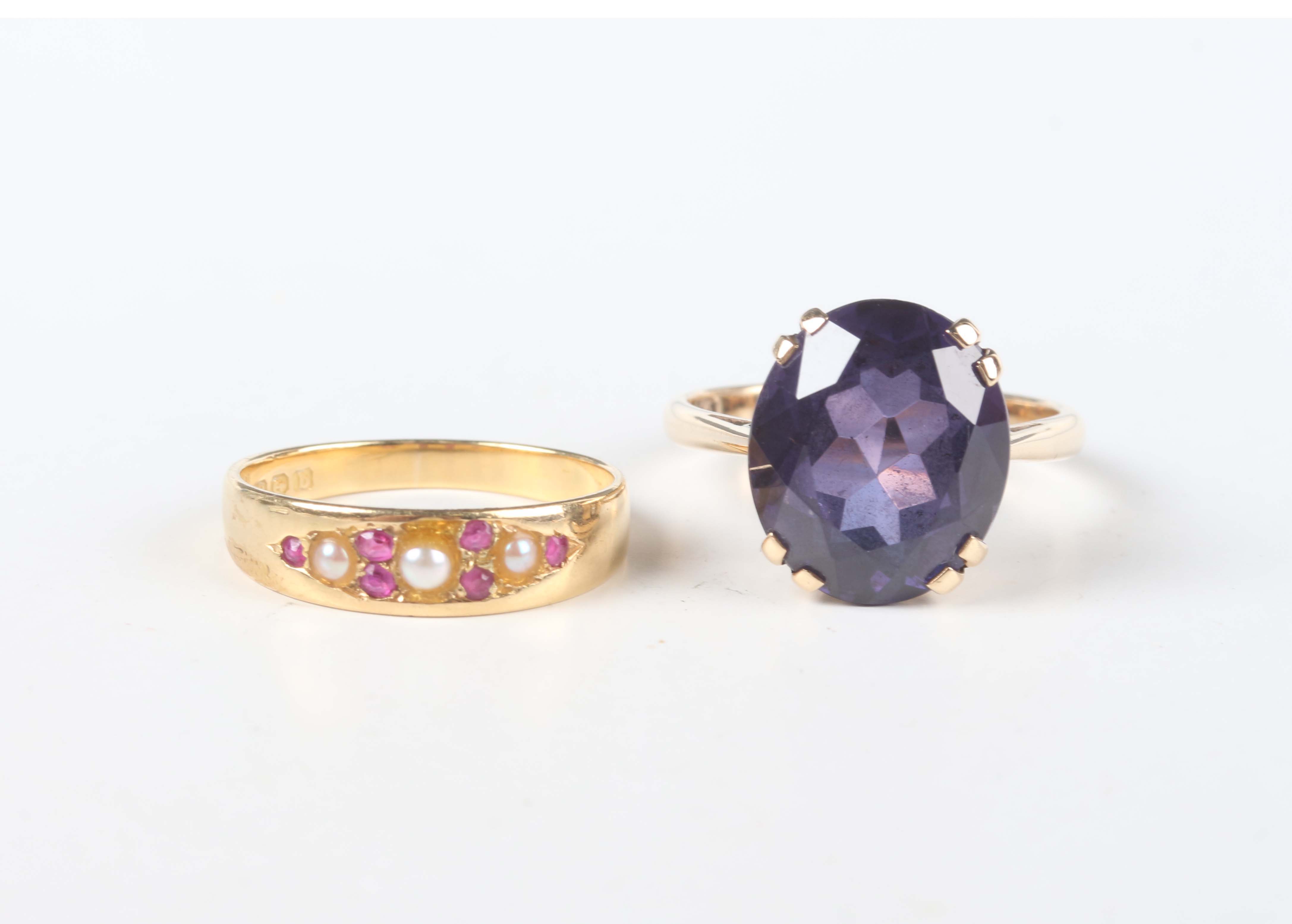 A gold ring, claw set with an oval cut purple stone, detailed ‘9ct’, weight 4.4g, ring size approx O1/2, and an 18ct gold, ruby and half-pearl ring, mounted with six cushion shaped rubies and three half-pearls in a boat shaped setting, Birmingham 1901, ring size approx L1/2, weight 2.4g.