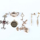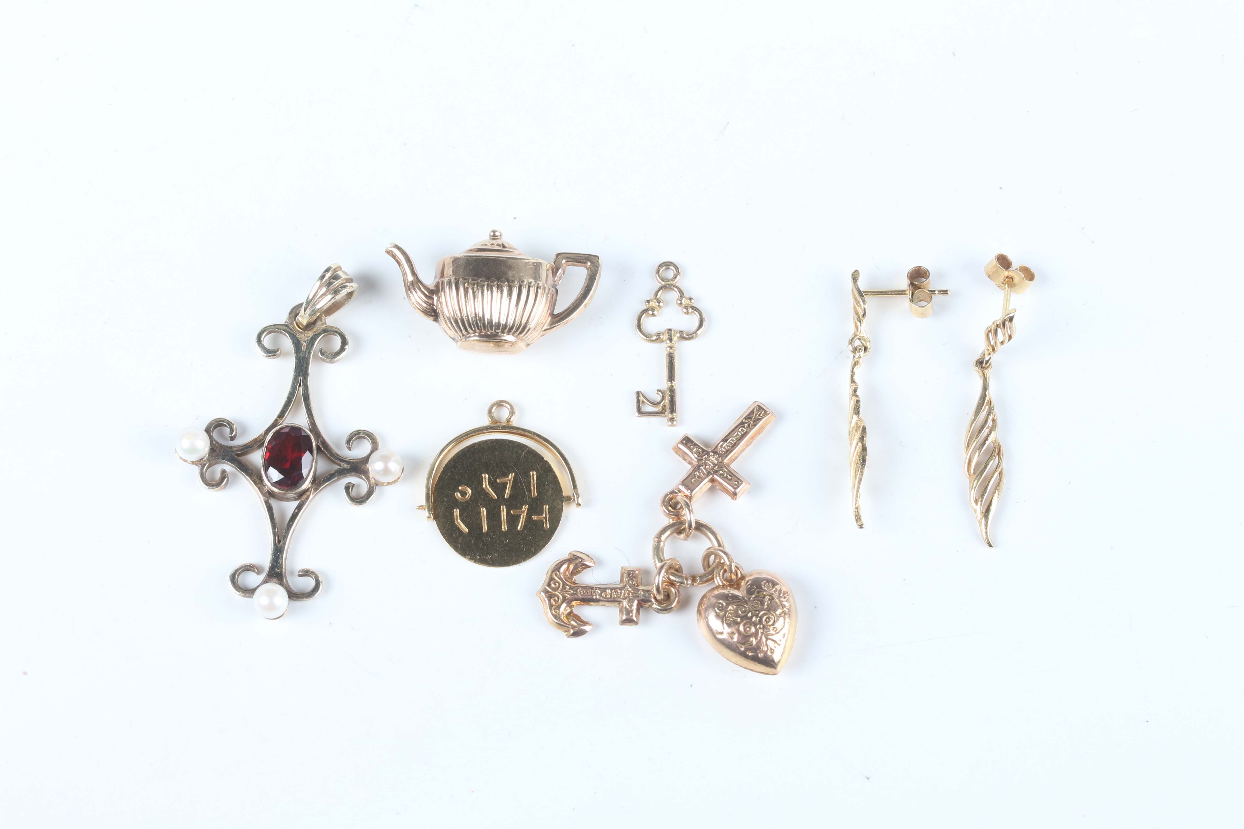 Four 9ct gold charms, comprising a teapot, faith, hope and charity, a spinner, detailed ‘Happy Days’, and a '21' key, and a pair of 9ct gold pendant earrings, total weight 4.9g, together with a silver gilt, garnet and cultured pearl pendant, length 3.9cm.