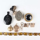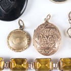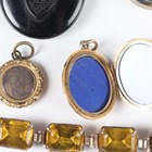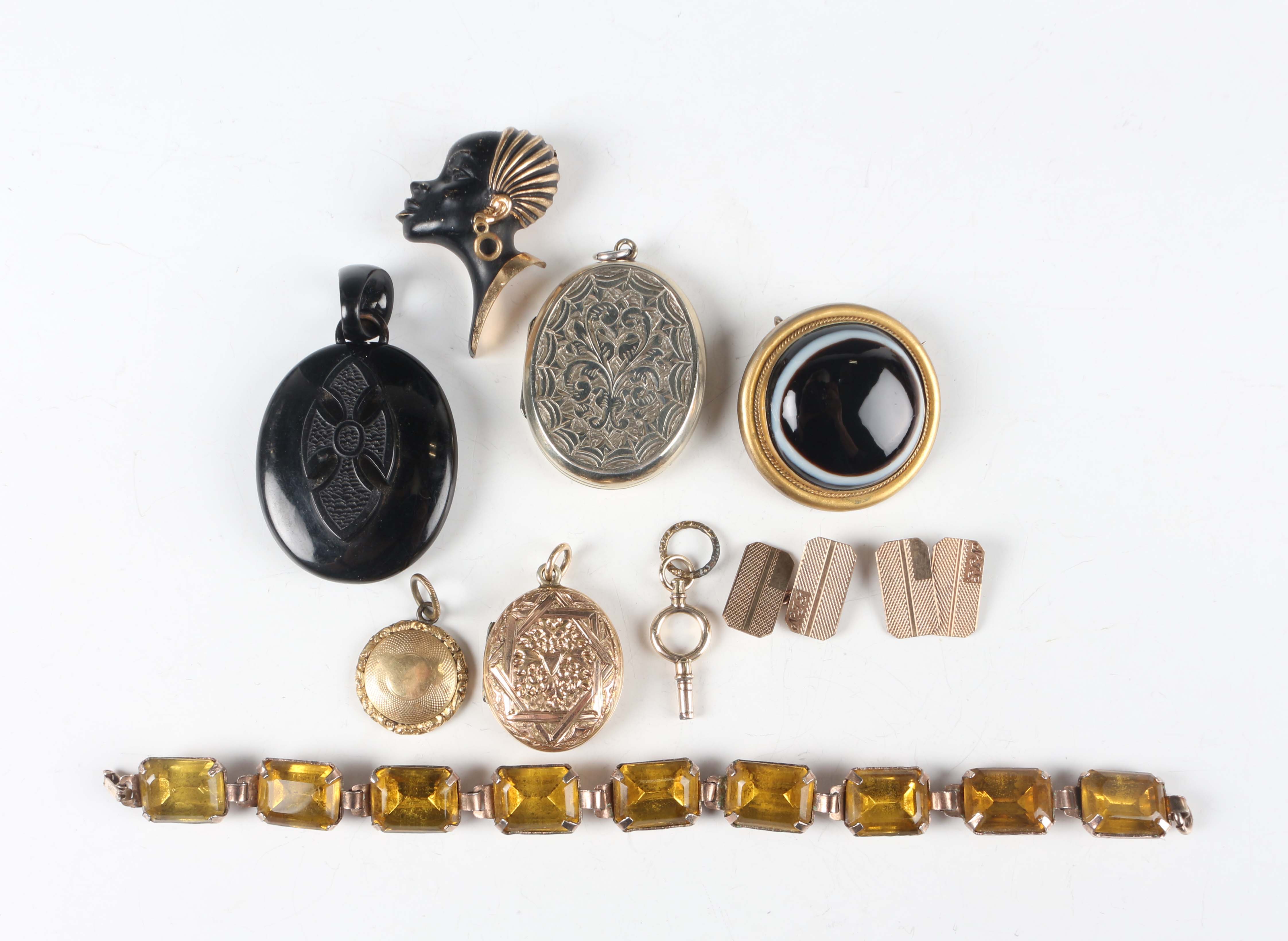 A Victorian oval pendant locket with floral and foliate decoration, a Victorian oval mourning pendant locket, a Victorian circular pendant locket with a glazed hair locket compartment, another oval pendant locket, a gilt metal mounted banded agate brooch, a brooch designed as the head of a blackamoor, a silver mounted yellow paste bracelet, detailed ‘Sterling’, a pair of gold back and front rectangular cufflinks, weight 5.9g, and a watch key.