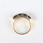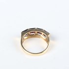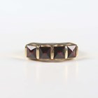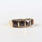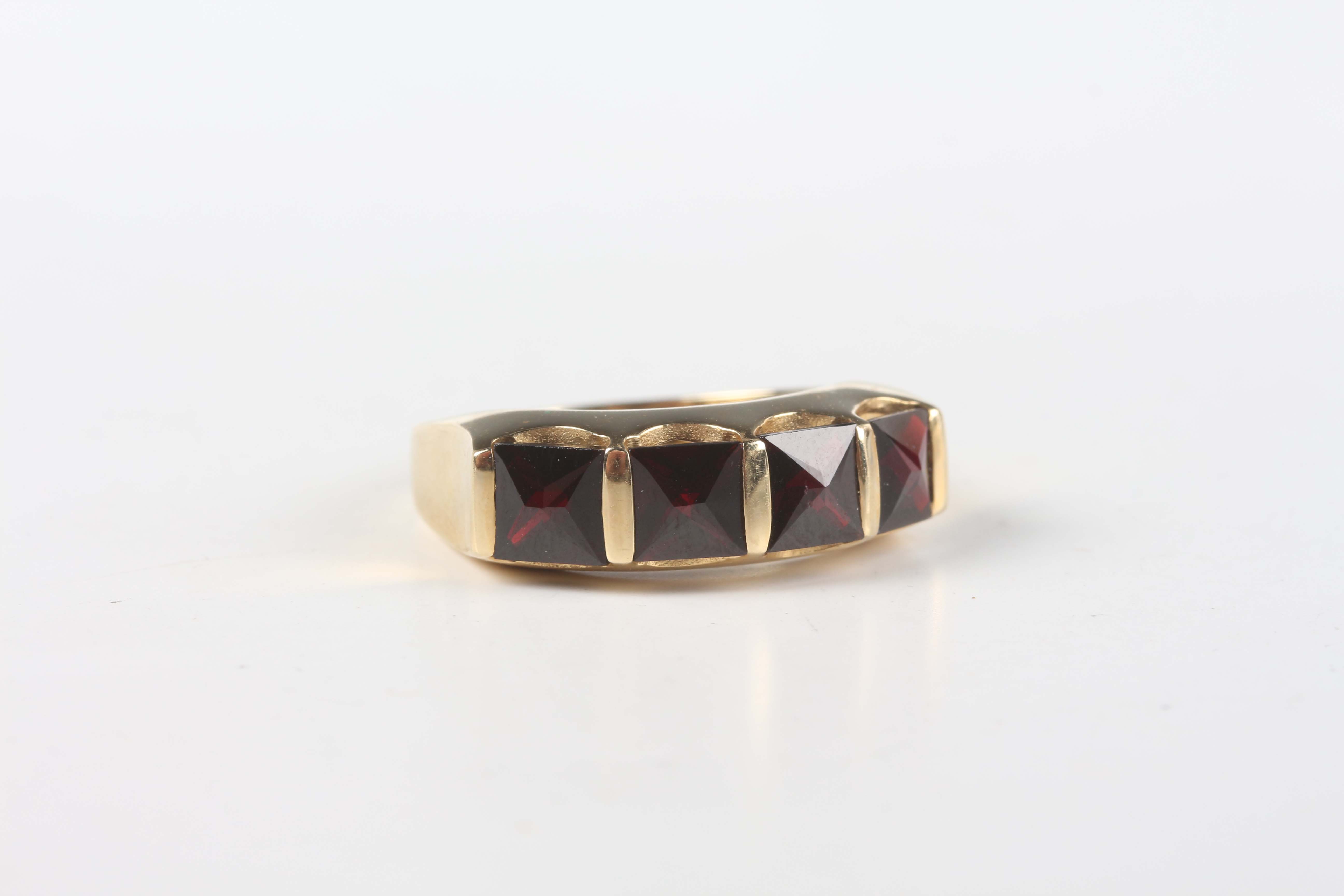 A gold and garnet four stone ring, mounted with square cut garnets, detailed '14K', weight 5.1g, ring size approx O, with a case.