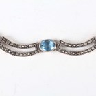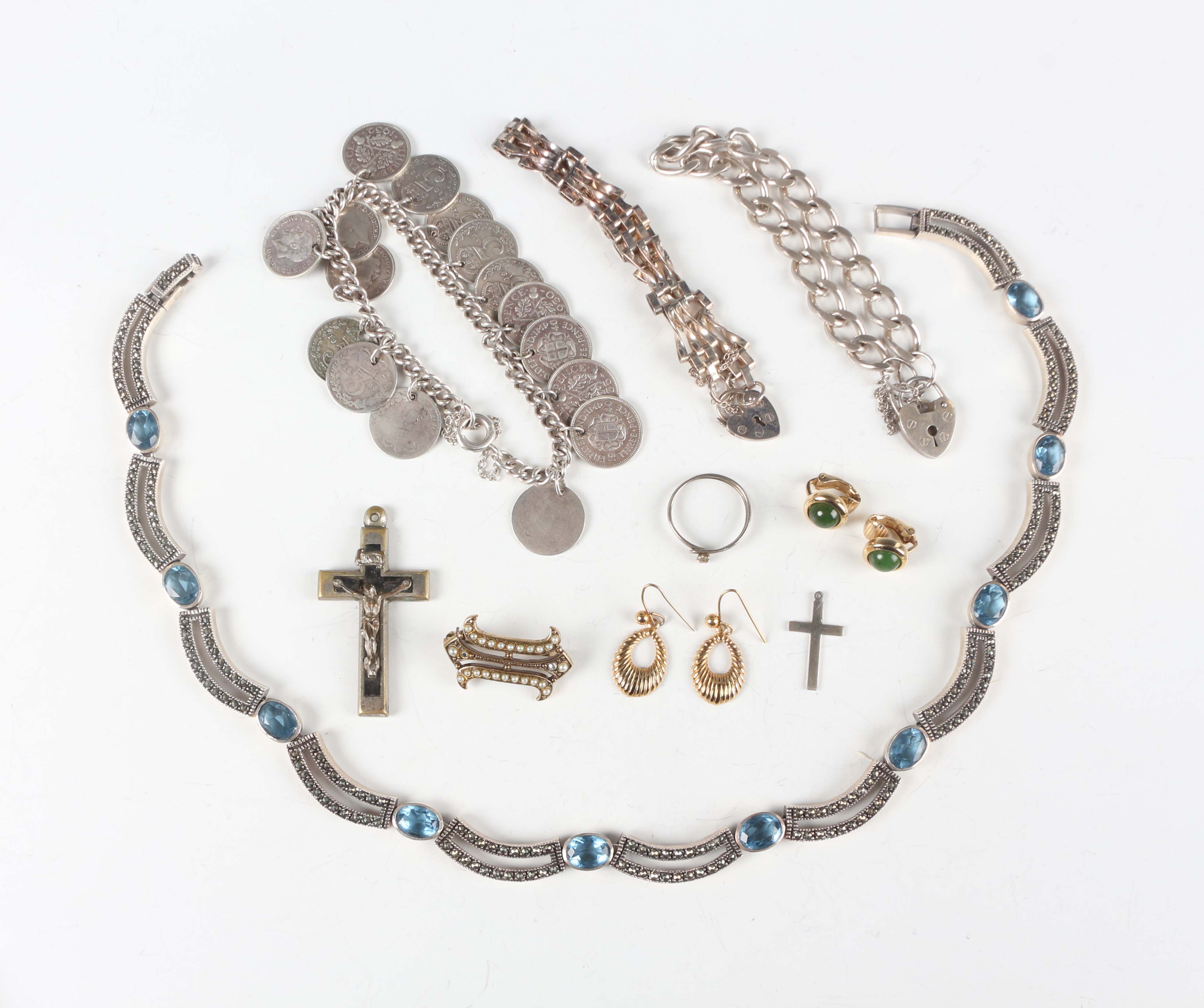 A group of silver and other jewellery, comprising a silver, marcasite and pale blue gem set collar necklace with a foldover clasp, detailed ‘925’, a gate link bracelet with a heart shaped padlock clasp, a faceted curblink bracelet with a heart shaped padlock clasp, another curblink bracelet, fitted with silver threepences, and six further items of costume jewellery.