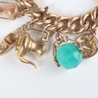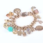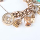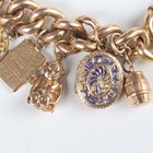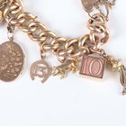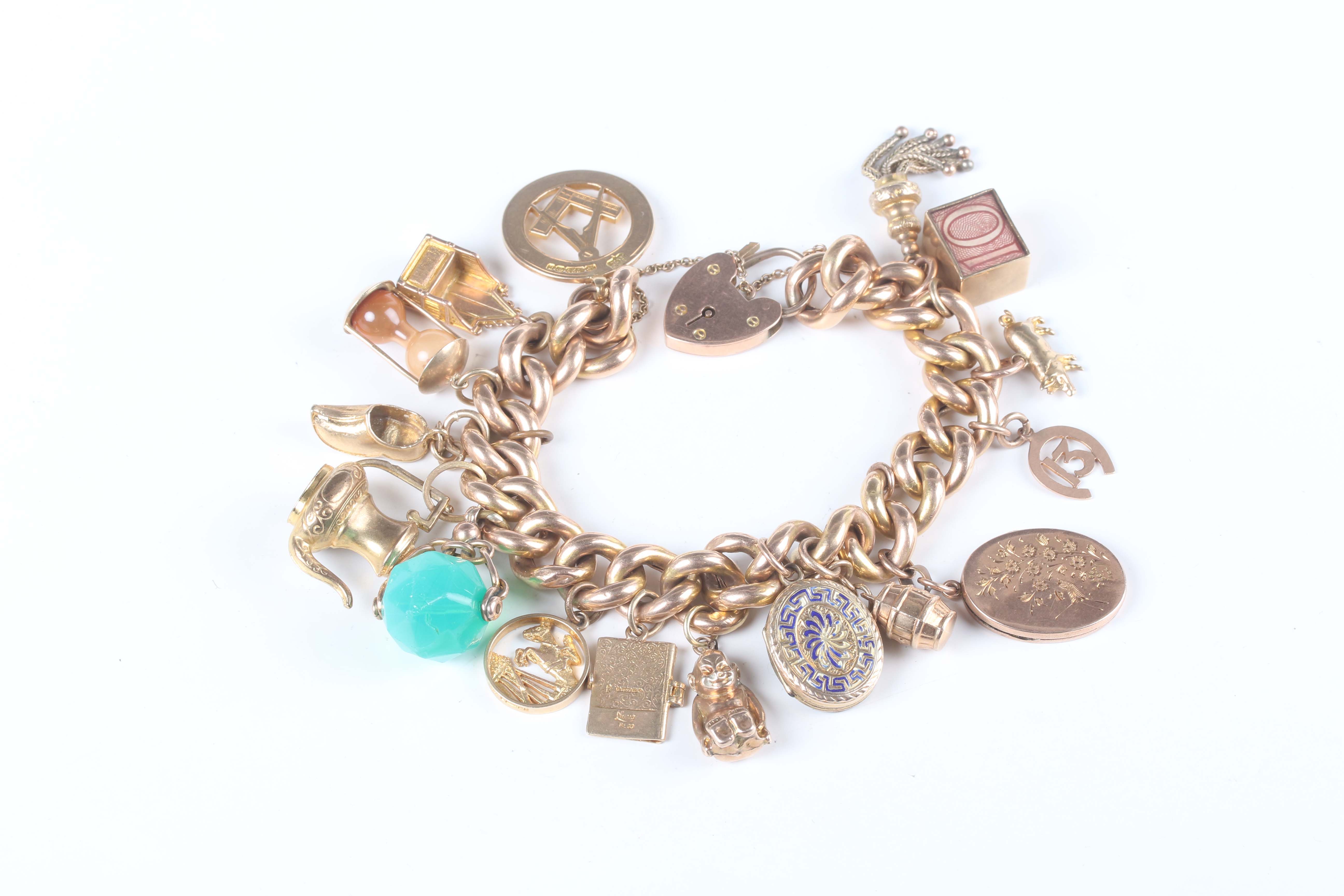A gold hollow curblink charm bracelet on a gold heart shaped padlock clasp, detailed ‘9ct’, fitted with sixteen pendants and charms, including a 15ct gold Masonic fob, seven 9ct gold charms, including a passport and a ten shillings note, and eight unmarked, total weight 69.2g, length 18.5cm.