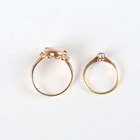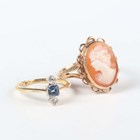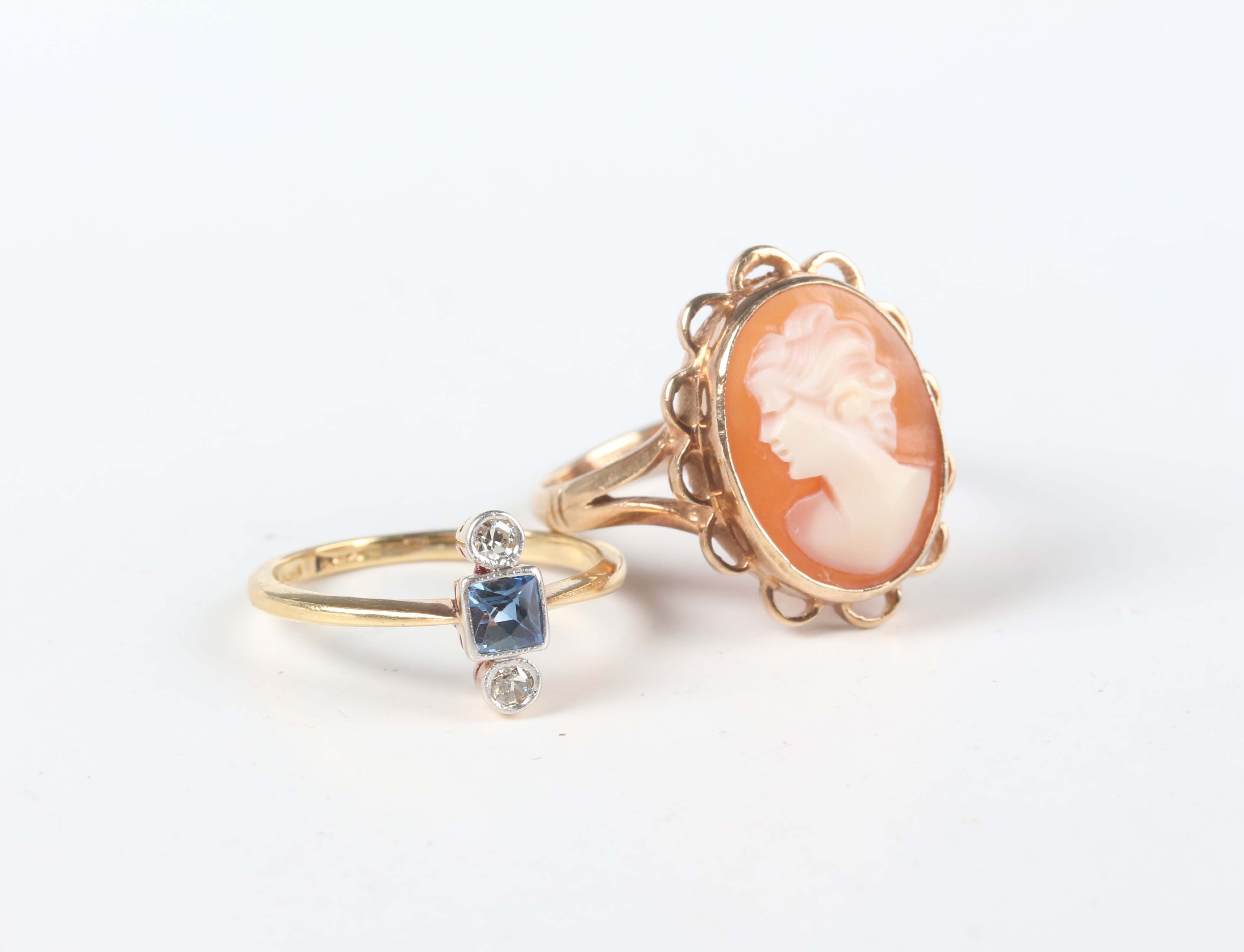 A gold, sapphire and diamond three stone ring, mounted with a square cut sapphire between two diamonds, detailed ‘18ct Plat’, weight 1.6g, ring size approx G1/2, and a 9ct gold and oval shell cameo ring, carved as a portrait of a lady, Birmingham 1969, weight 3g, ring size approx O.