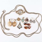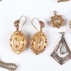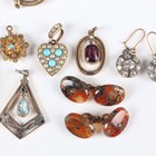 A pair of Victorian gilt oval pendant earrings, decorated with beaded edges and wire fittings, a pair of colourless paste cluster pendant earrings, a pale blue imitation turquoise and imitation half-pearl heart shaped pendant, three further gem set pendants, a pair of moss agate cufflinks, a long guard chain and a Victorian brooch.