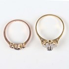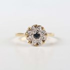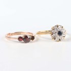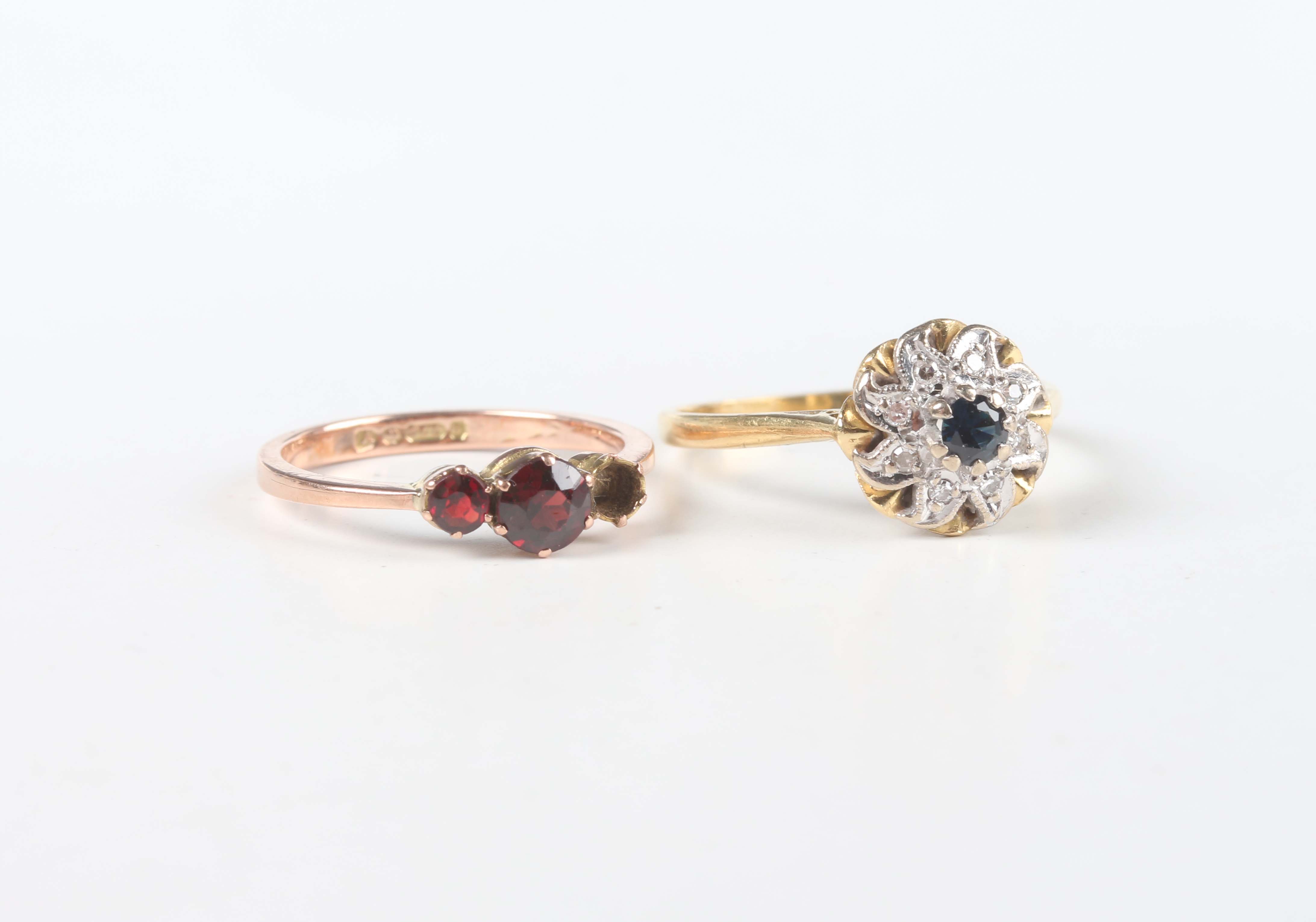 An 18ct gold, sapphire and diamond cluster ring, mounted with the circular cut sapphire within a surround of eight circular cut diamonds in a sunburst design, London 1968, weight 3.3g, ring size approx O1/2, and a 9ct gold ring, mounted with two circular cut garnets, Birmingham 1920, weight 1.5g, ring size approx K (a third garnet lacking).