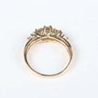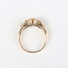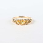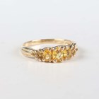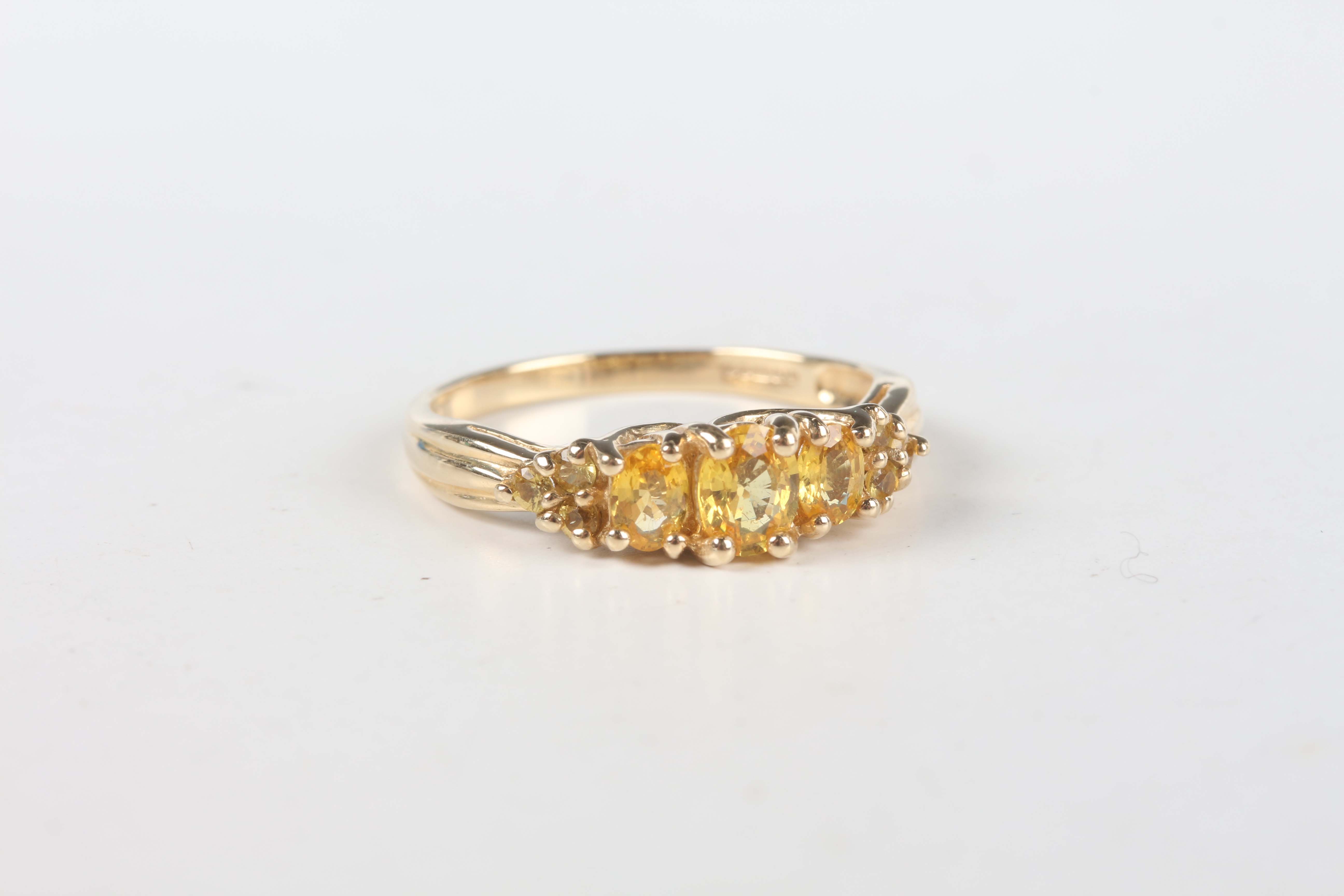 A 9ct gold and citrine ring, mounted with three principal oval cut citrines between smaller circular cut citrine set three stone shoulders, weight 2.4g, ring size approx N.