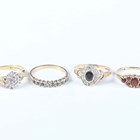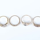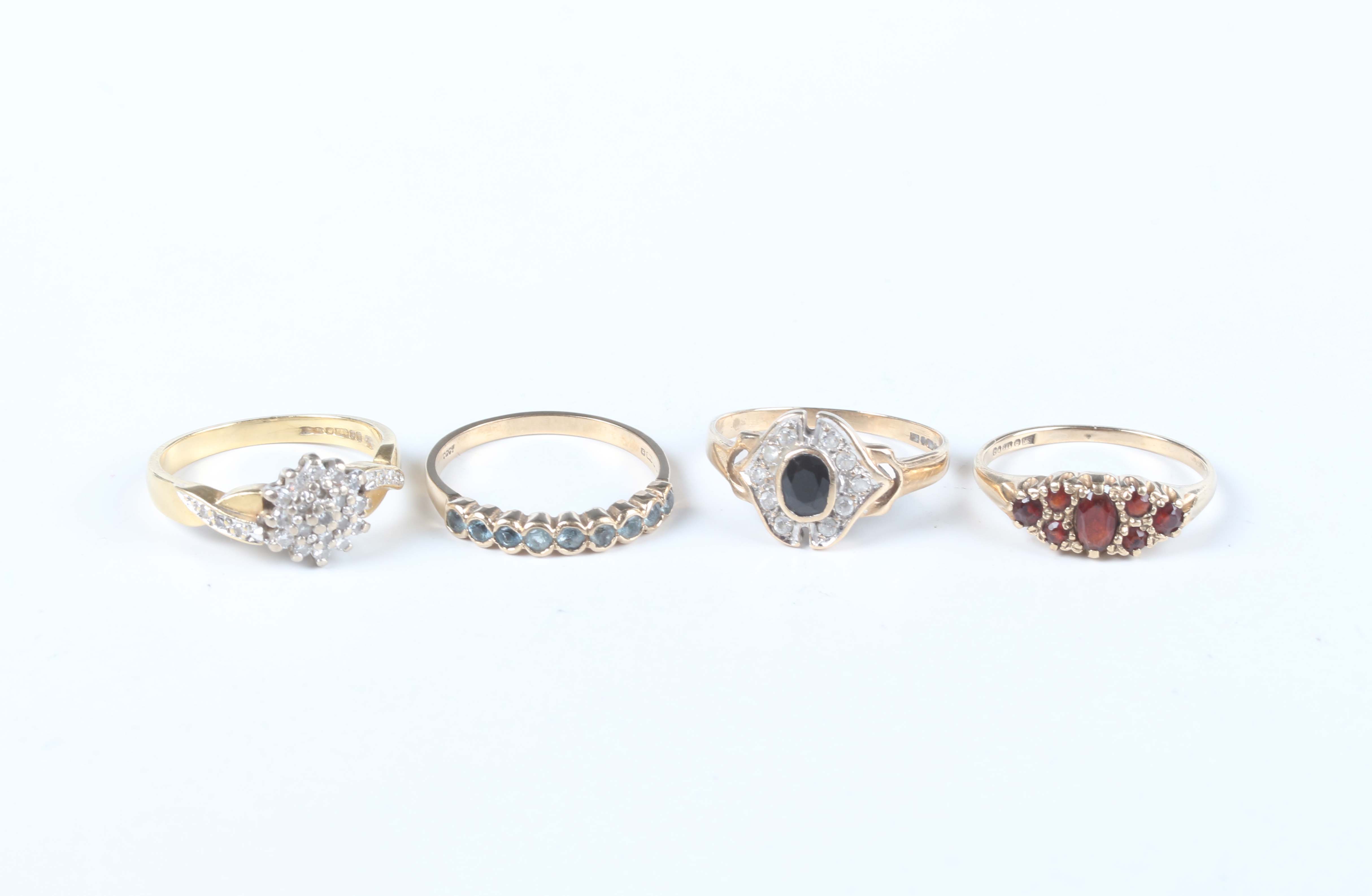 An 18ct gold and diamond cluster ring in a twistover design, weight 3.9g, ring size approx M, a 9ct gold, sapphire and colourless gem set cluster ring, collet set with the oval cut sapphire at the centre, ring size approx O1/2, a 9ct gold and garnet ring, ring size approx M1/2, and a 9ct gold and pale blue gem set nine stone half hoop ring, ring size approx N1/2, total weight 5.2g.