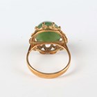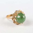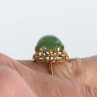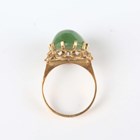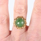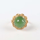 An 18ct gold and nephrite solitaire ring, claw set with a circular cabochon nephrite within a bark textured two tier scalloped surround, weight 4.7g, ring size approx N, with a case.