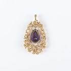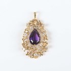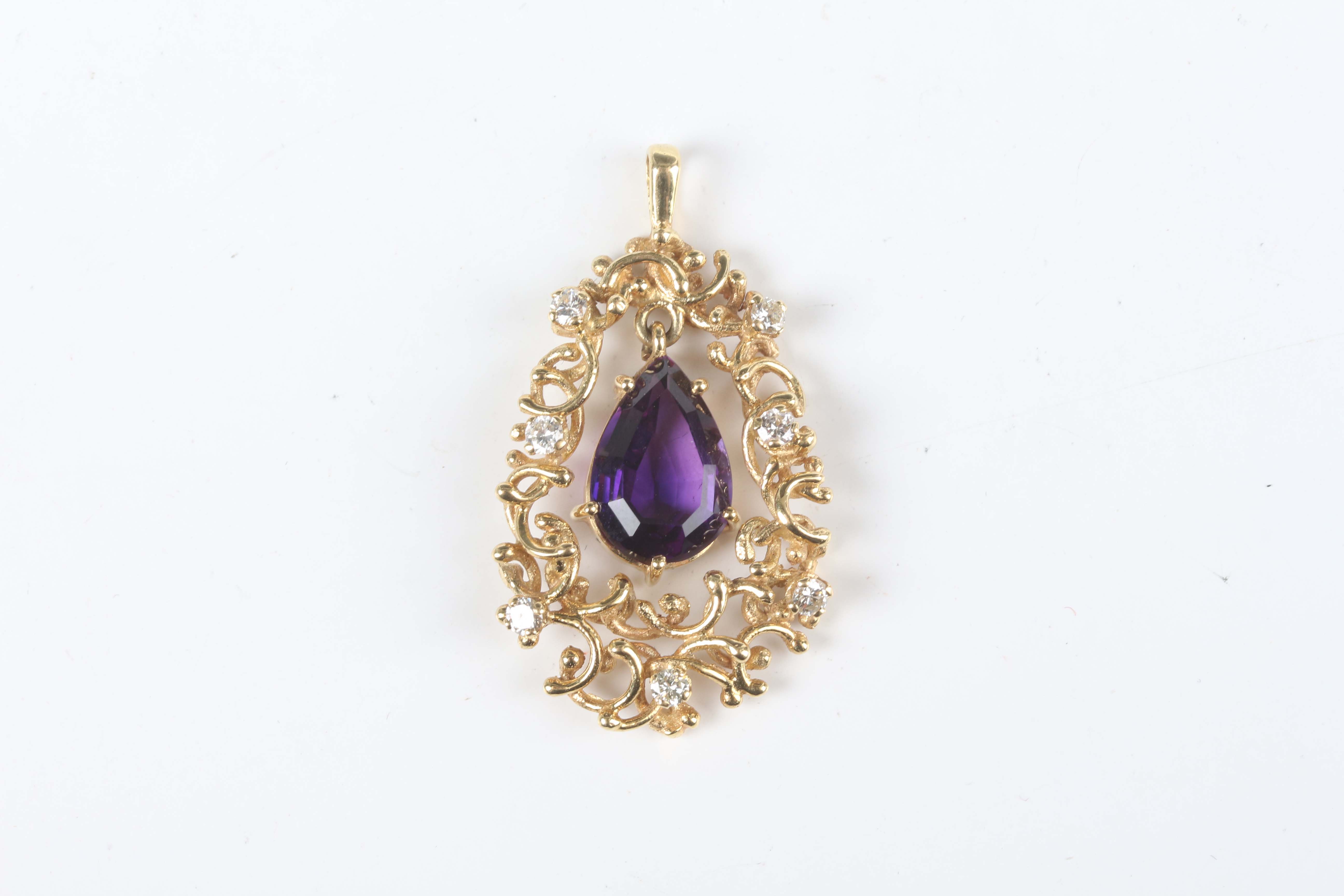 An 18ct gold, amethyst and diamond pendant, the swing centre claw set with a pear shaped amethyst within a naturalistic surround, mounted with seven circular cut diamonds at intervals, weight 7g, length 3.7cm.