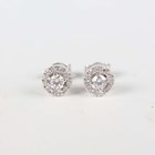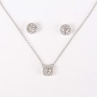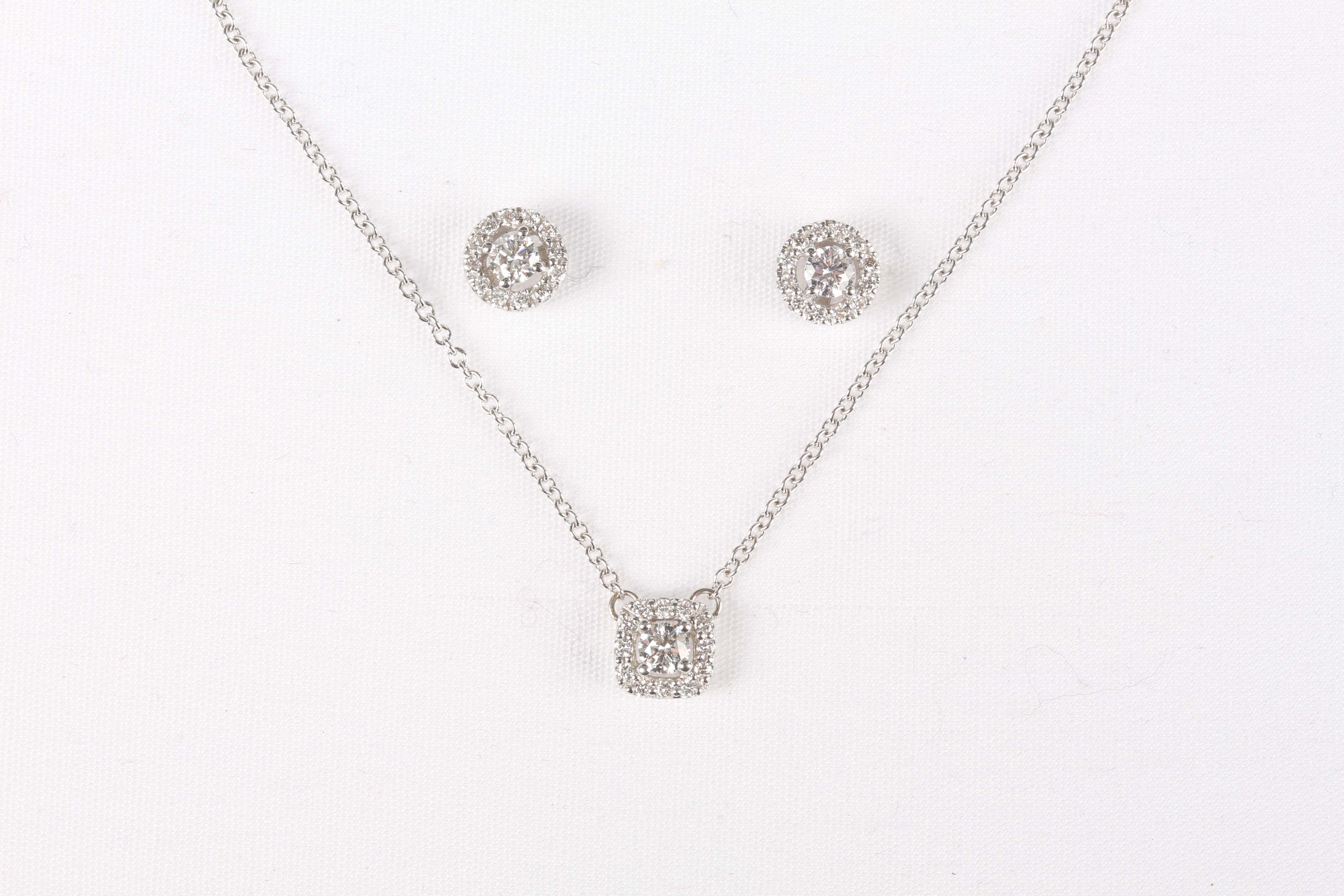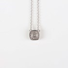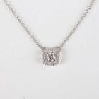 An 18ct white gold and diamond square cluster pendant necklace, claw set with a circular cut diamond within an open surround, mounted with smaller circular cut diamonds, detailed '750', width 6mm, on a sprung hook shaped clasp, detailed '750', length 42cm, and a pair of similar 18ct white gold and diamond circular cluster earstuds with post and butterfly fittings, detailed '750', total weight 4g, with a case.