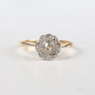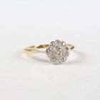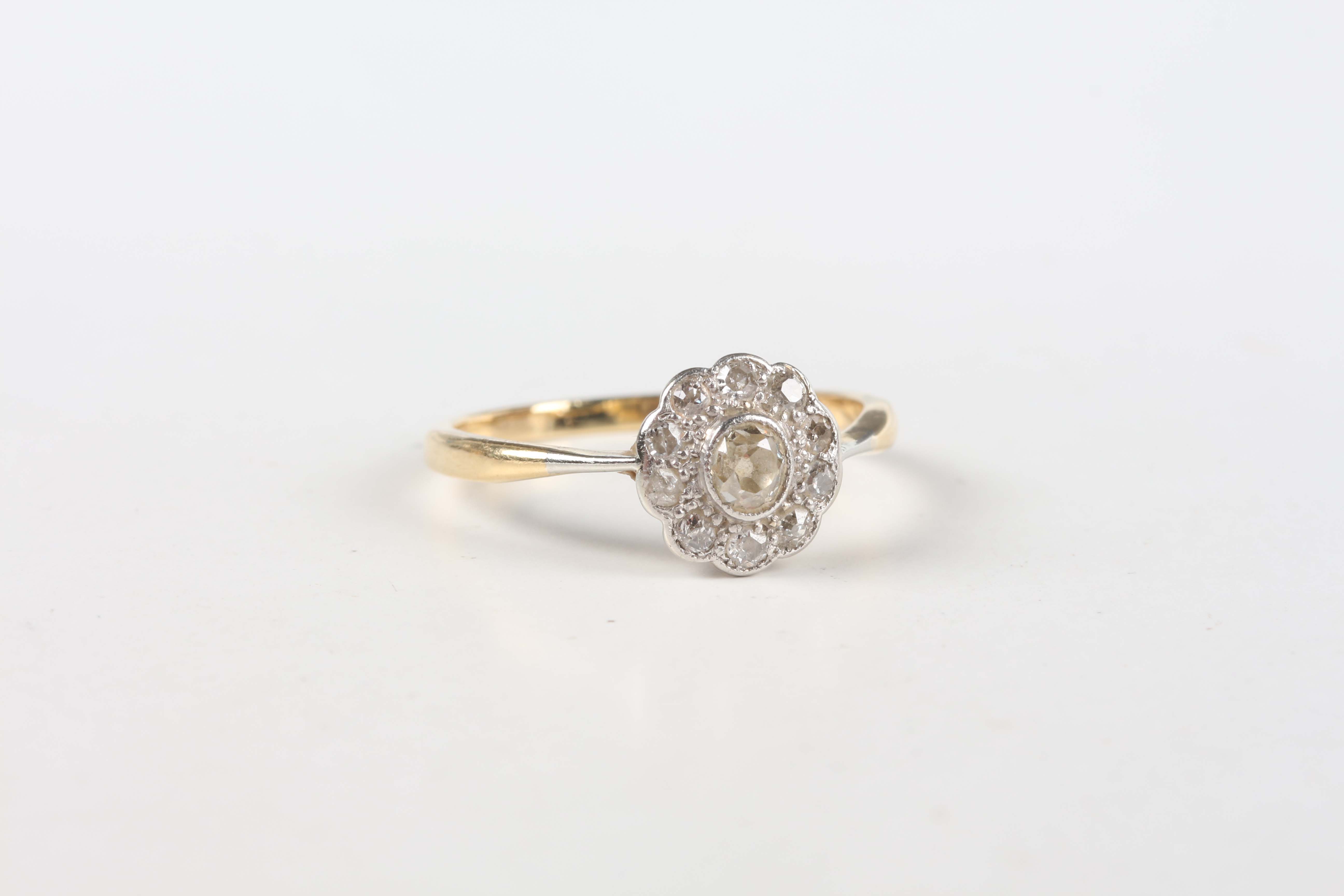 A gold and diamond cluster ring, collet set with the principal old cut cushion shaped diamond within a surround of ten smaller old cut cushion shaped diamonds, unmarked, weight 2.5g, ring size approx P.