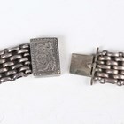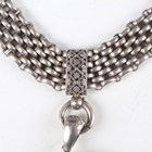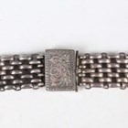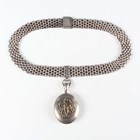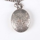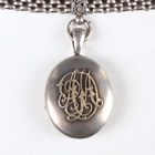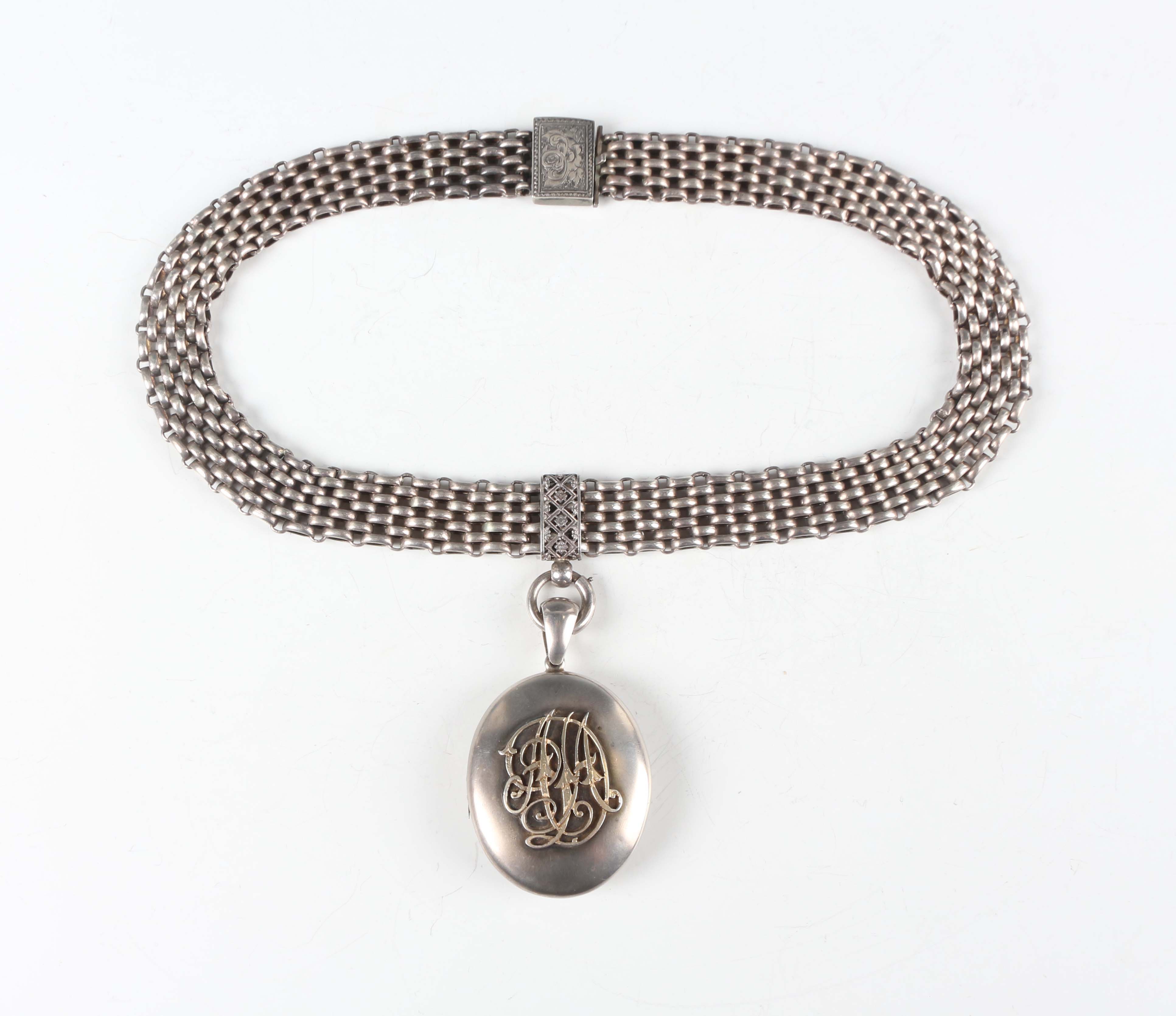 A Victorian silver oval pendant locket, applied with a gilt monogram to one side and floral and foliate engraved decoration to the other, unmarked, length 6.1cm, fitted to a silver wide oval link collar necklace on a snap clasp, unmarked, length 46.5cm.
