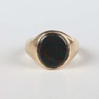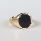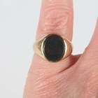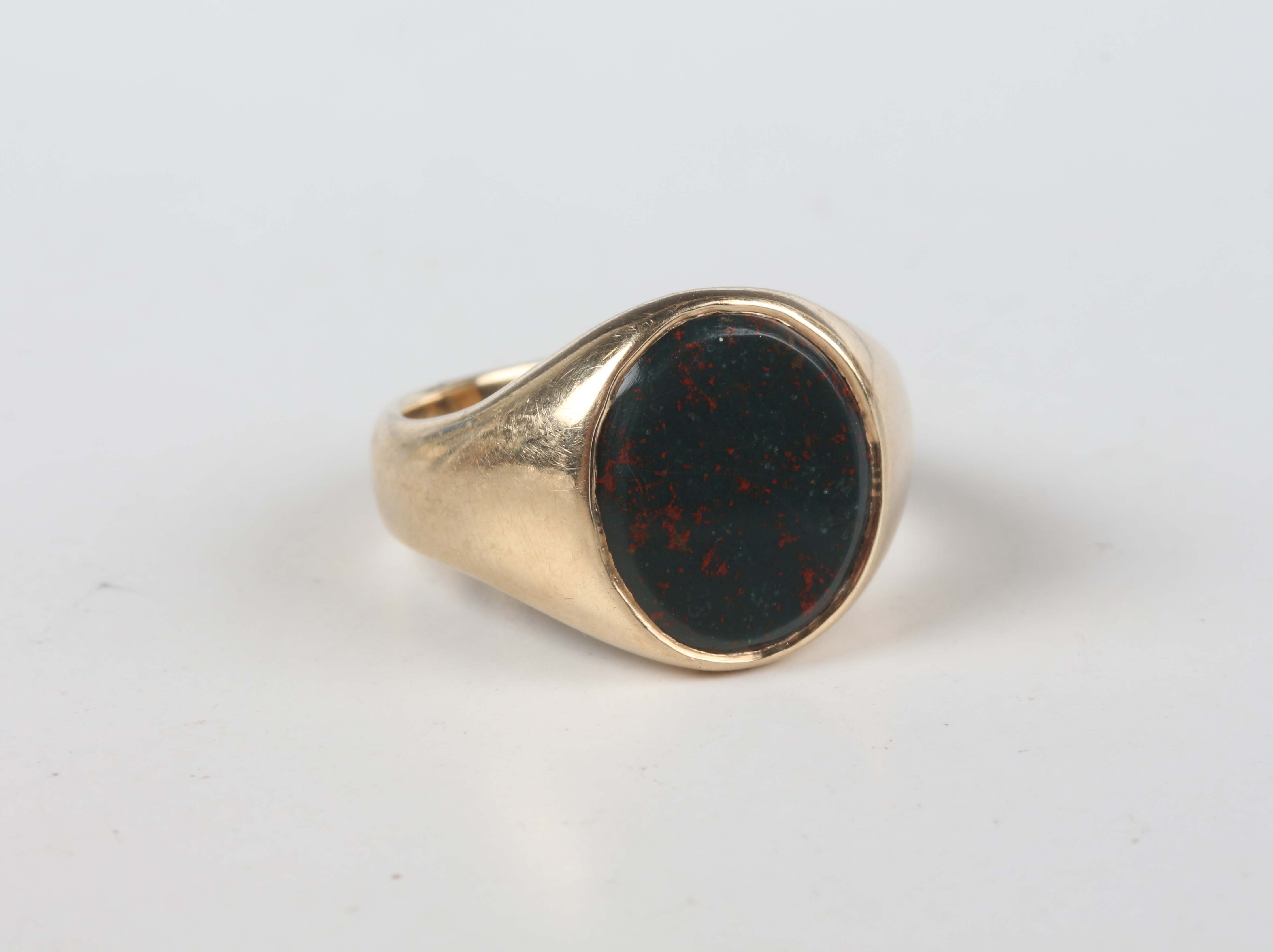 A gold and bloodstone oval signet ring, unmarked, weight 6.2g, ring size approx K.