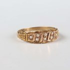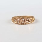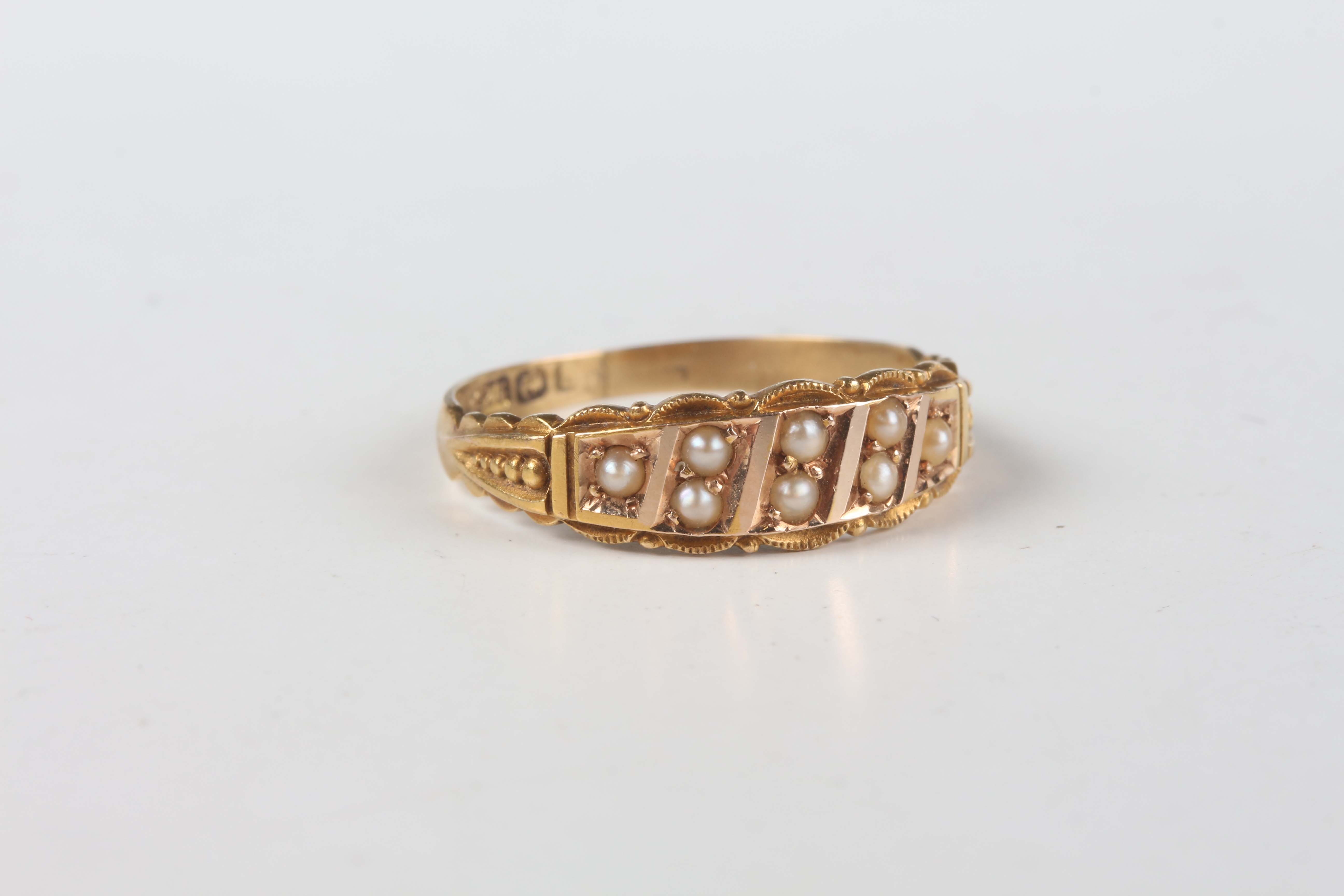 A 15ct gold and seed pearl ring, mounted with eight seed pearls between tapered beaded shoulders, Birmingham 1900, weight 2.7g, ring size approx Q1/2.