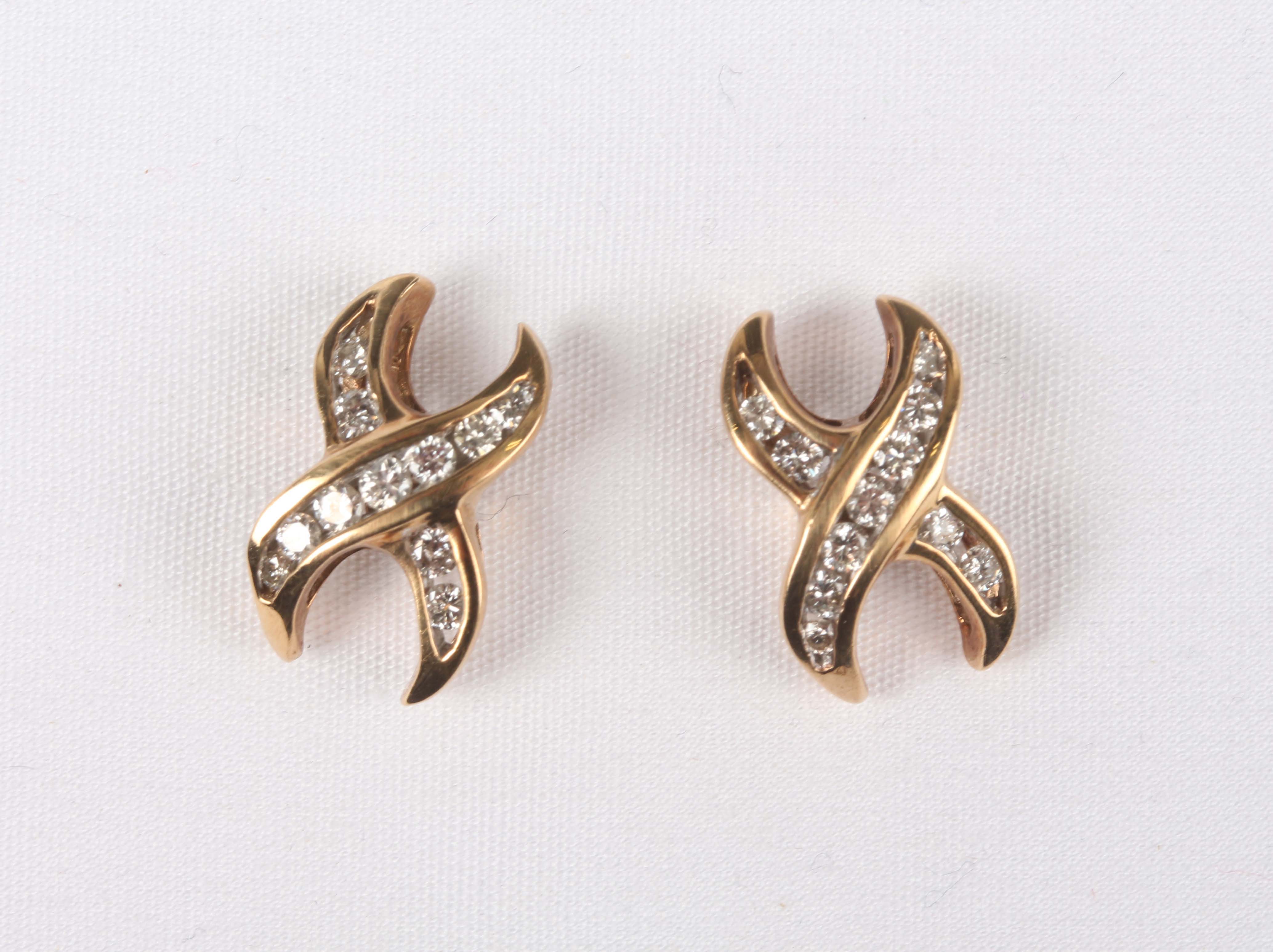 A pair of 9ct gold and diamond earstuds, each in an ‘X’ shaped design, mounted with circular cut diamonds, with post and butterfly fittings, total weight 3.2g, length 1.5cm.