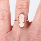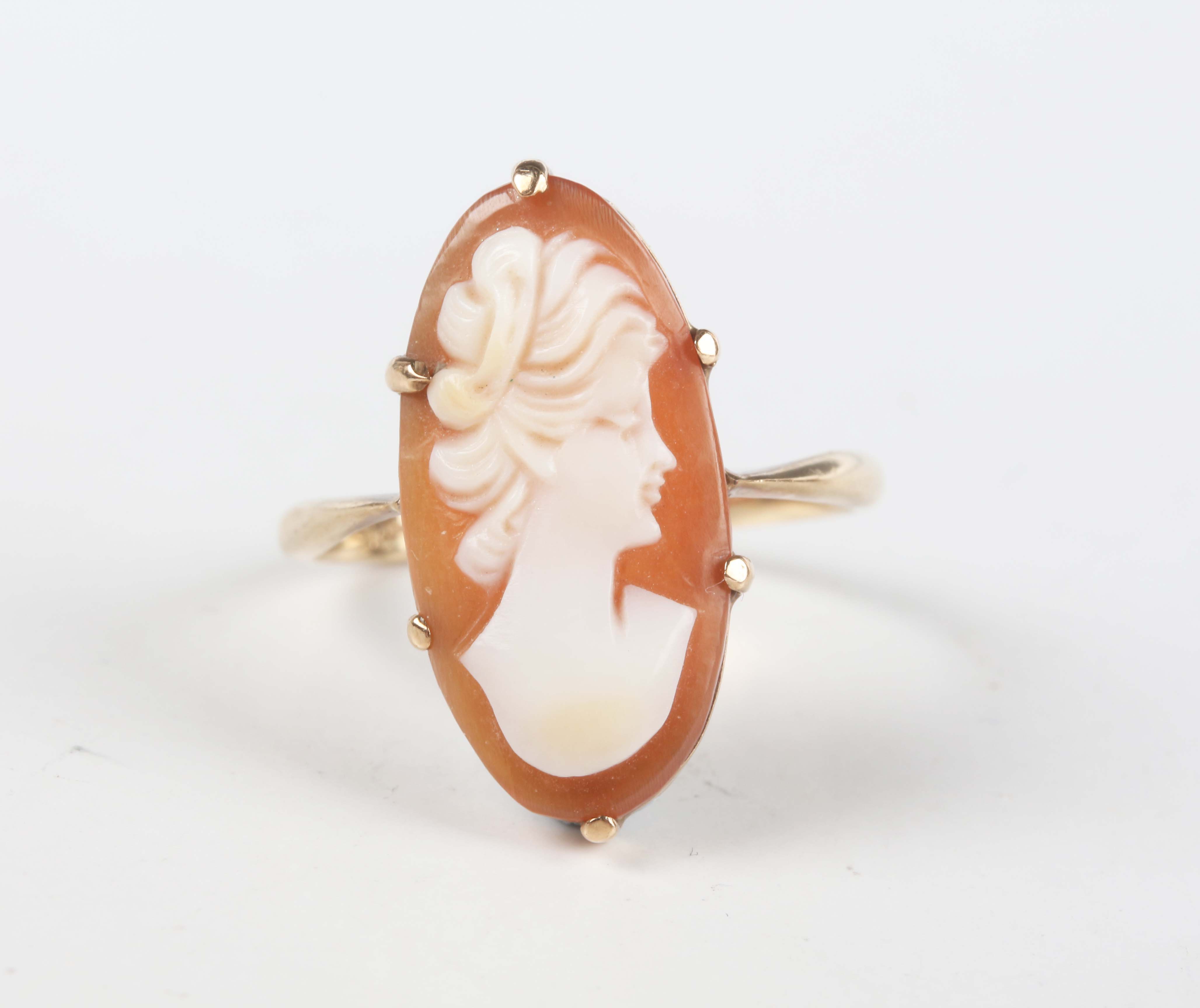 A gold ring, claw set with an oval shell cameo, carved as a portrait of a lady, detailed ‘9ct’, weight 2.6g, ring size approx O.
