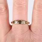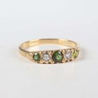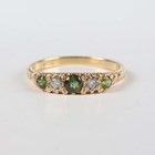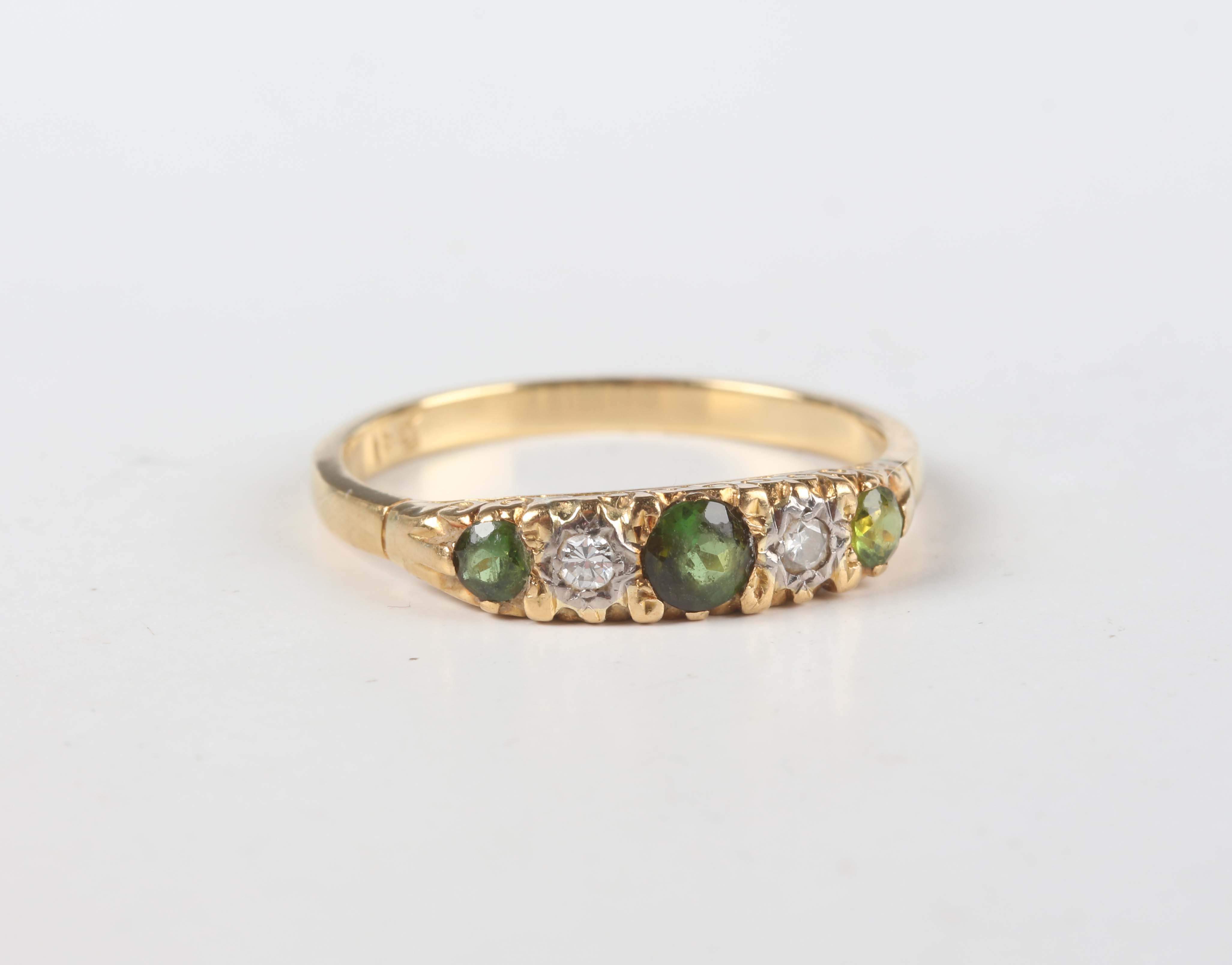 A gold, green tourmaline and diamond five stone ring, mounted with three circular cut green tourmalines alternating with two circular cut diamonds, detailed ‘18ct’, weight 4g, ring size approx U1/2.