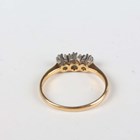 A gold and diamond three stone ring, claw set with a row of circular cut diamonds, detailed ‘18ct’, weight 2.2g, ring size approx L1/2.