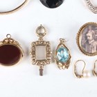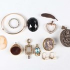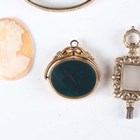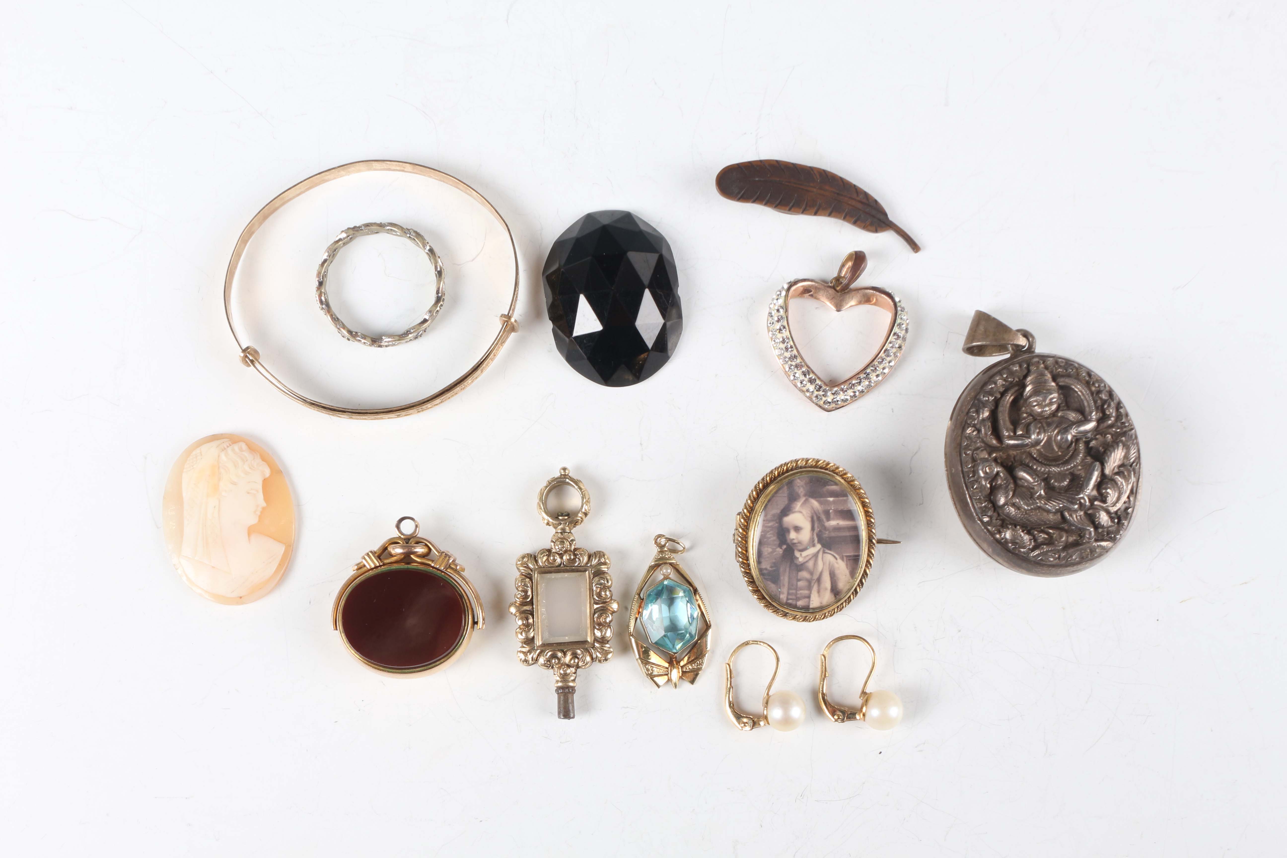 A group of jewellery, comprising a Victorian chalcedony watch key, length 4.2cm, a gold mounted rotating bloodstone and cornelian pendant fob, a gold and pale blue gem set pendant, detailed ‘585’, weight 1.8g, length 2.9cm, a Victorian brooch, glazed with a portrait of a girl, a pair of gold and cultured pearl earrings, an Asian oval pendant locket with a deity motif, and six further items.