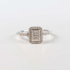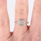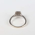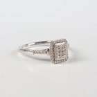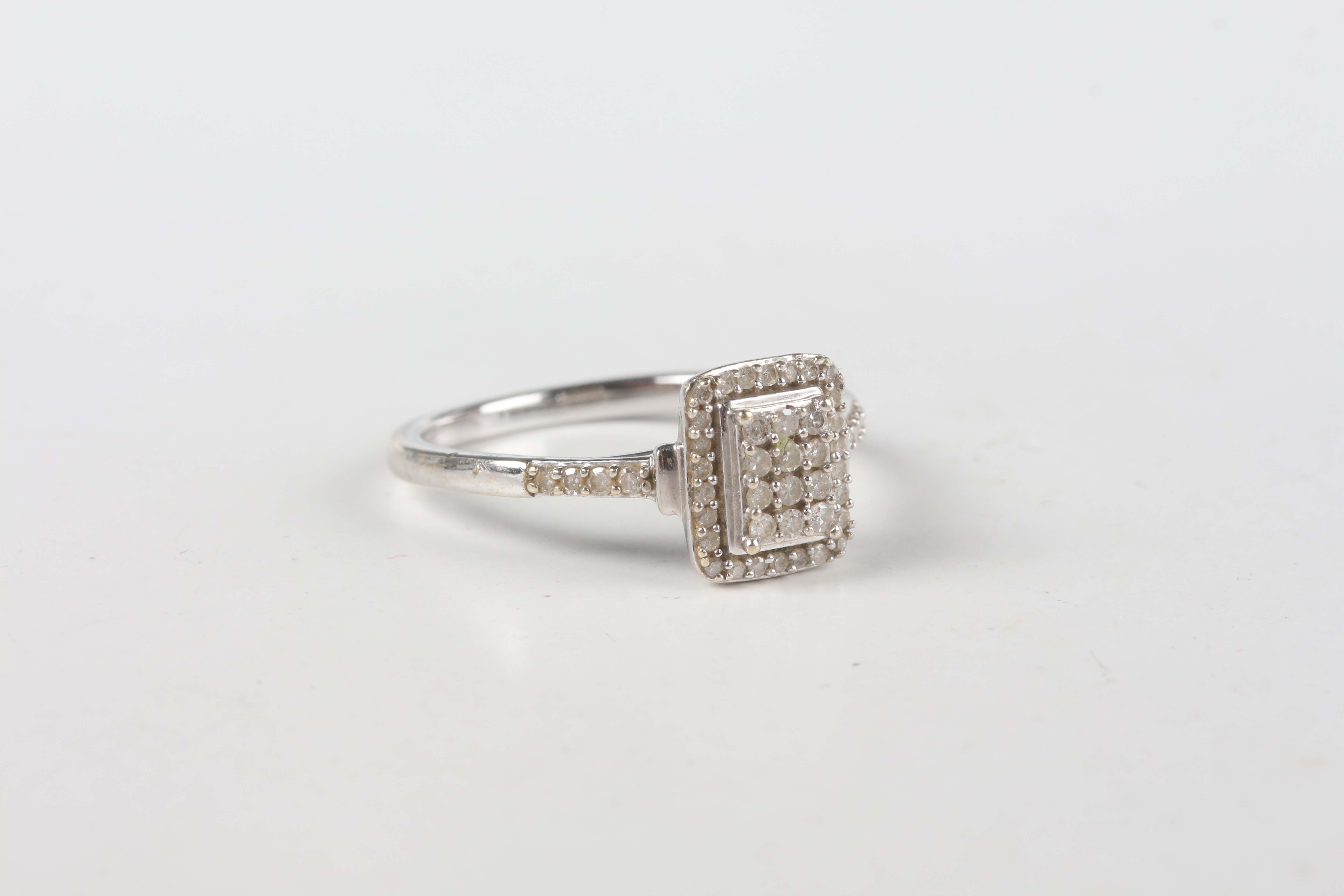 A 9ct white gold and diamond rectangular panel shaped cluster ring, mounted with circular cut diamonds between diamond set four stone shoulders, weight 2.2g, ring size approx M.
