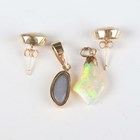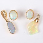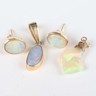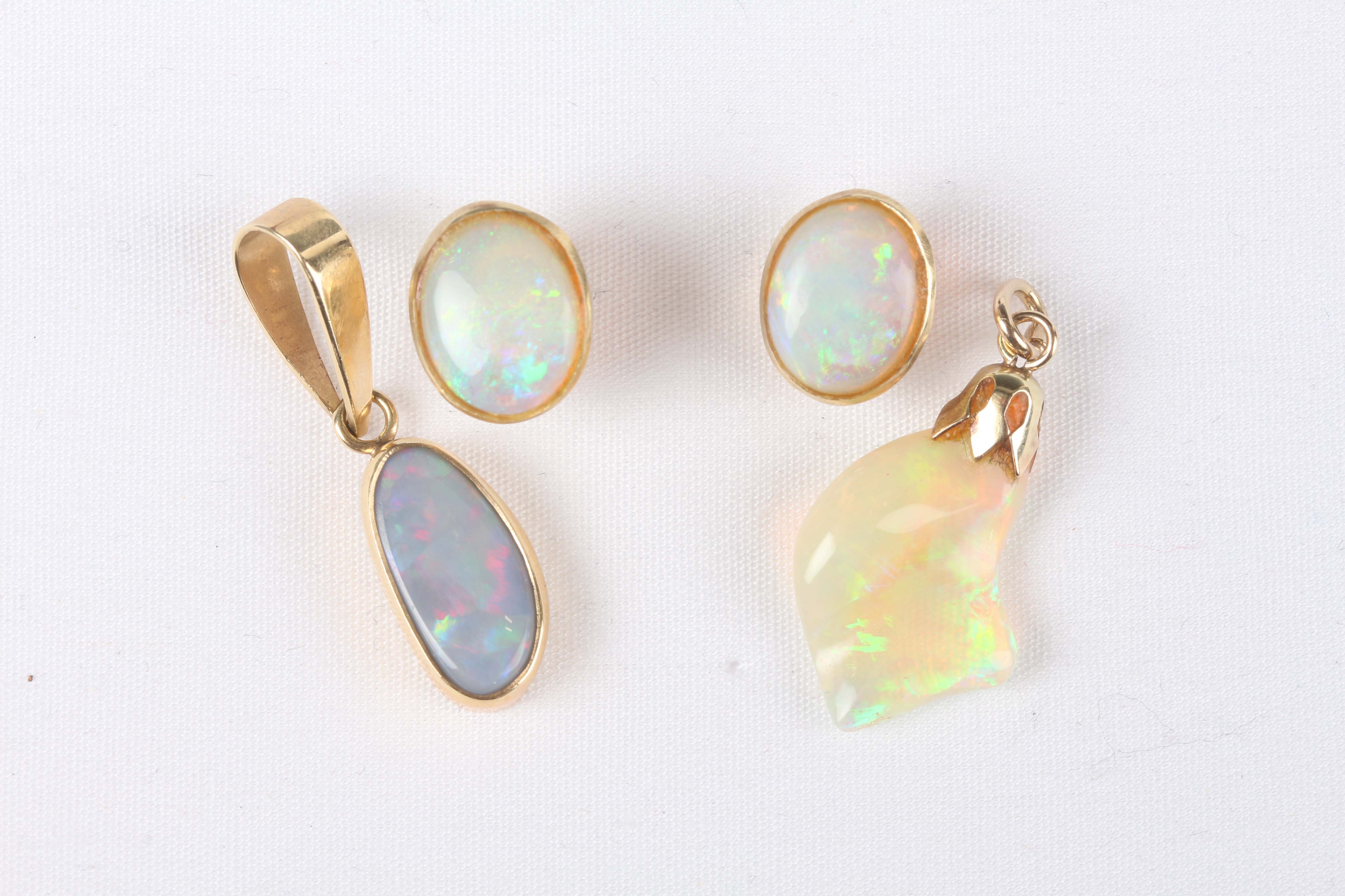 A pair of gold and opal single stone earstuds, each collet set with an oval opal, unmarked, with gold butterfly fittings, one detailed '585', the other '14KT', total weight 3.3g, a gold and opal single stone pendant, collet set with a shaped oval opal, indistinct marks, length 3cm, and another opal single stone pendant, the suspension loop detailed '375', length 2.7cm, total weight 3.2g, with a case.