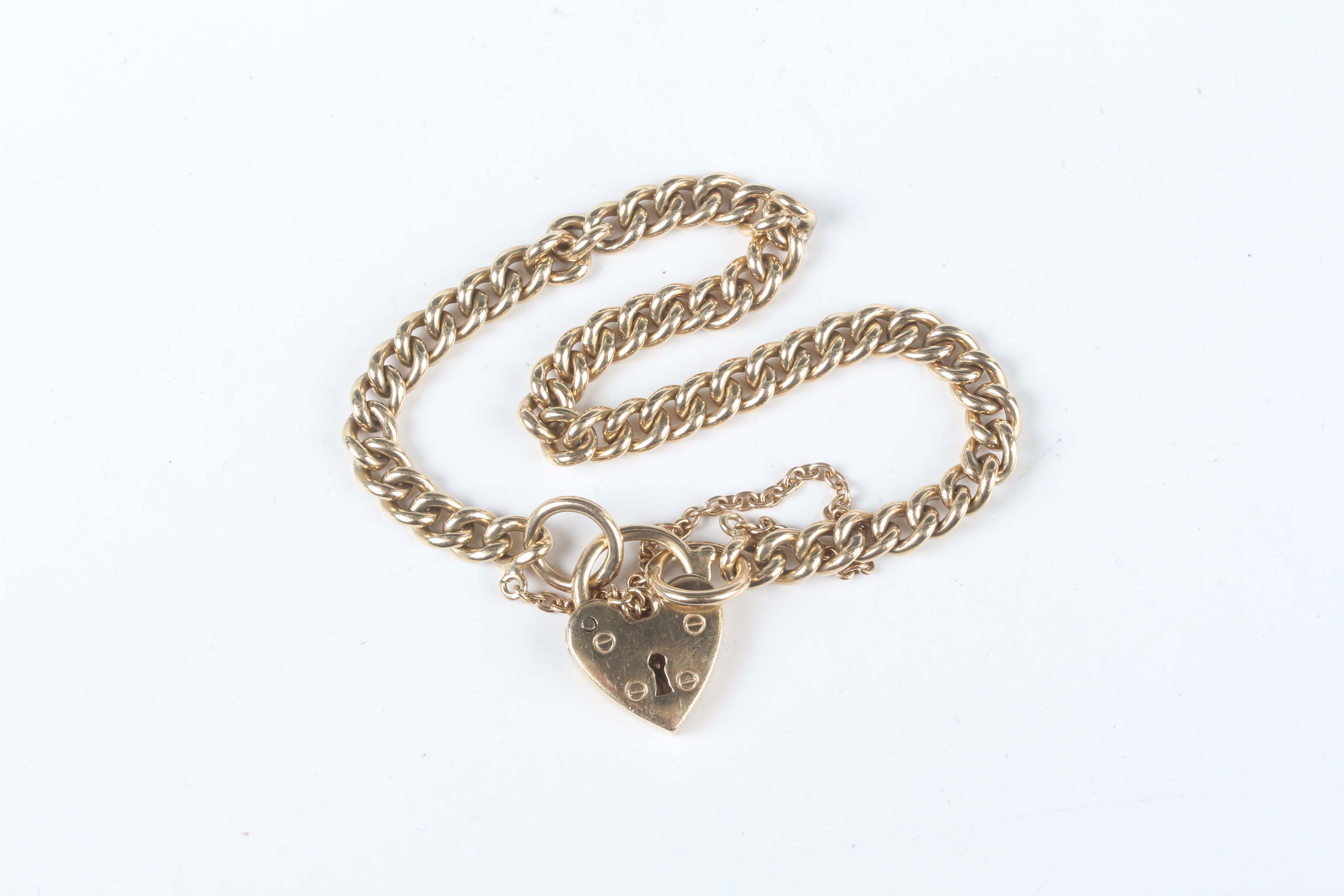 A gold solid curblink bracelet, detailed ‘9ct’, on a gold heart shaped padlock clasp, unmarked, total weight 15.8g, length 18.5cm.